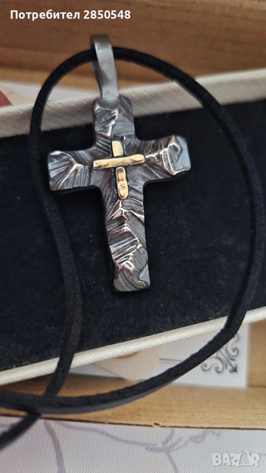 Сребърен кръст с малко позлатено кръстче, кожена връзка