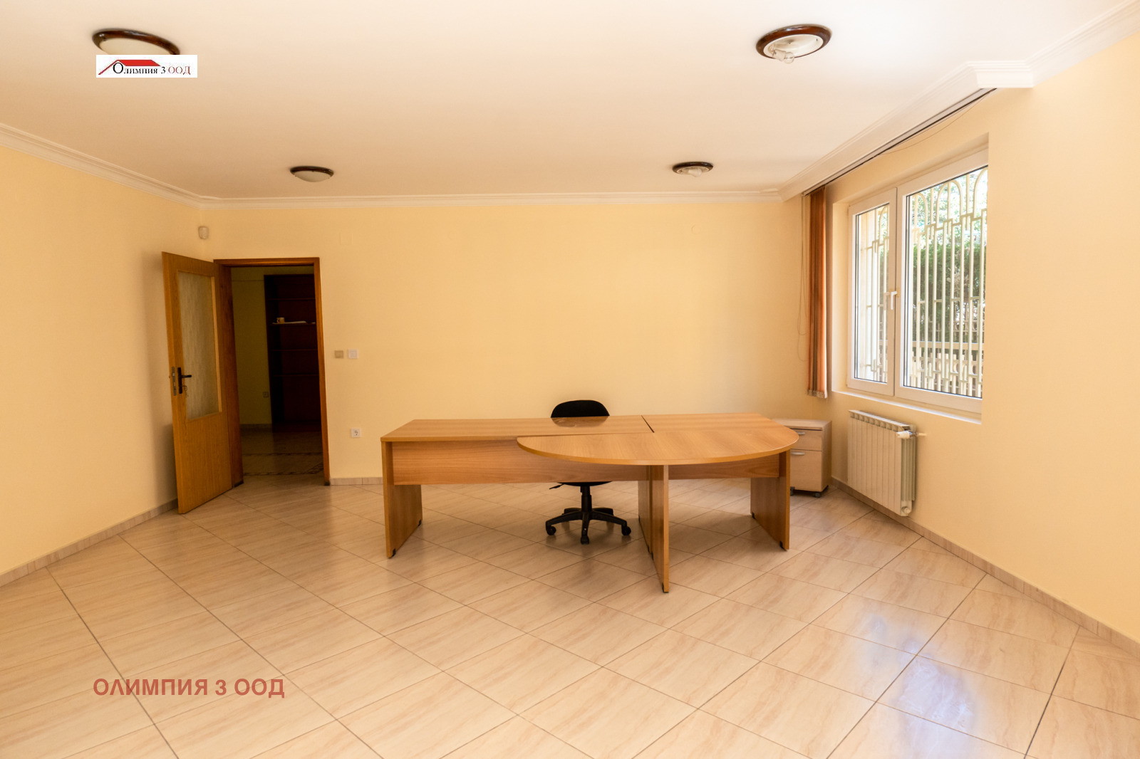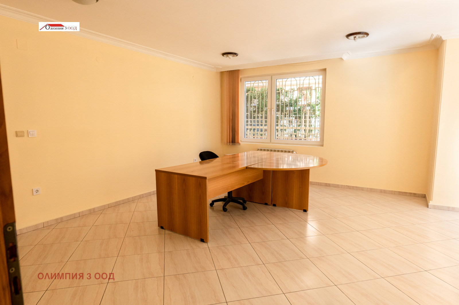 Разпределение: приемна, два просторни кабинета - единият с директен достъп към двора, обзаведена кухня и баня с тоалетна. Сградата разполага с централен ТЕЦ. ПВЦ-дограма. Блиндирана врата. Вграден гардероб в антрето.