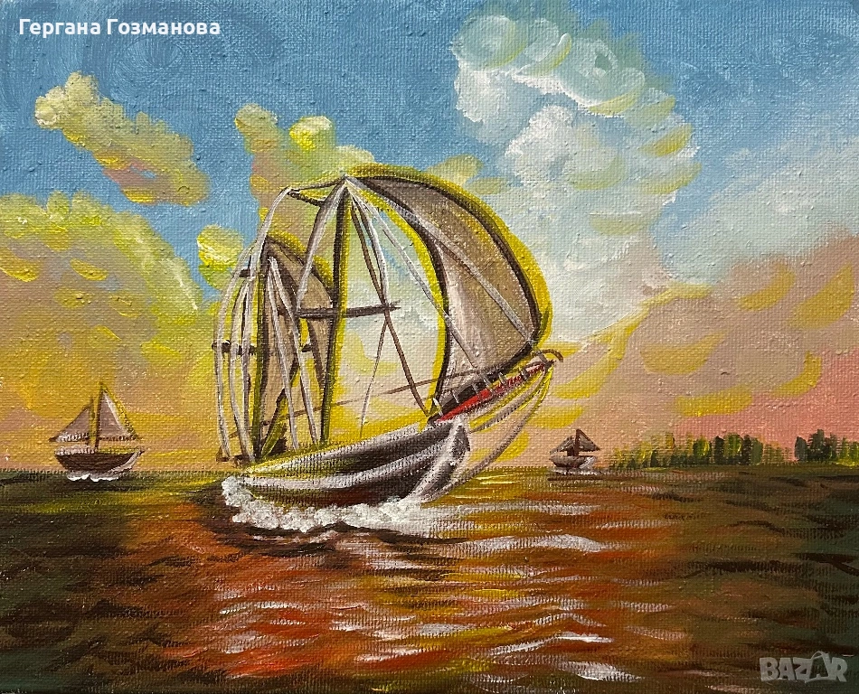 Картината е с размери 40/50см, рисувана на платно с акрилни бои.