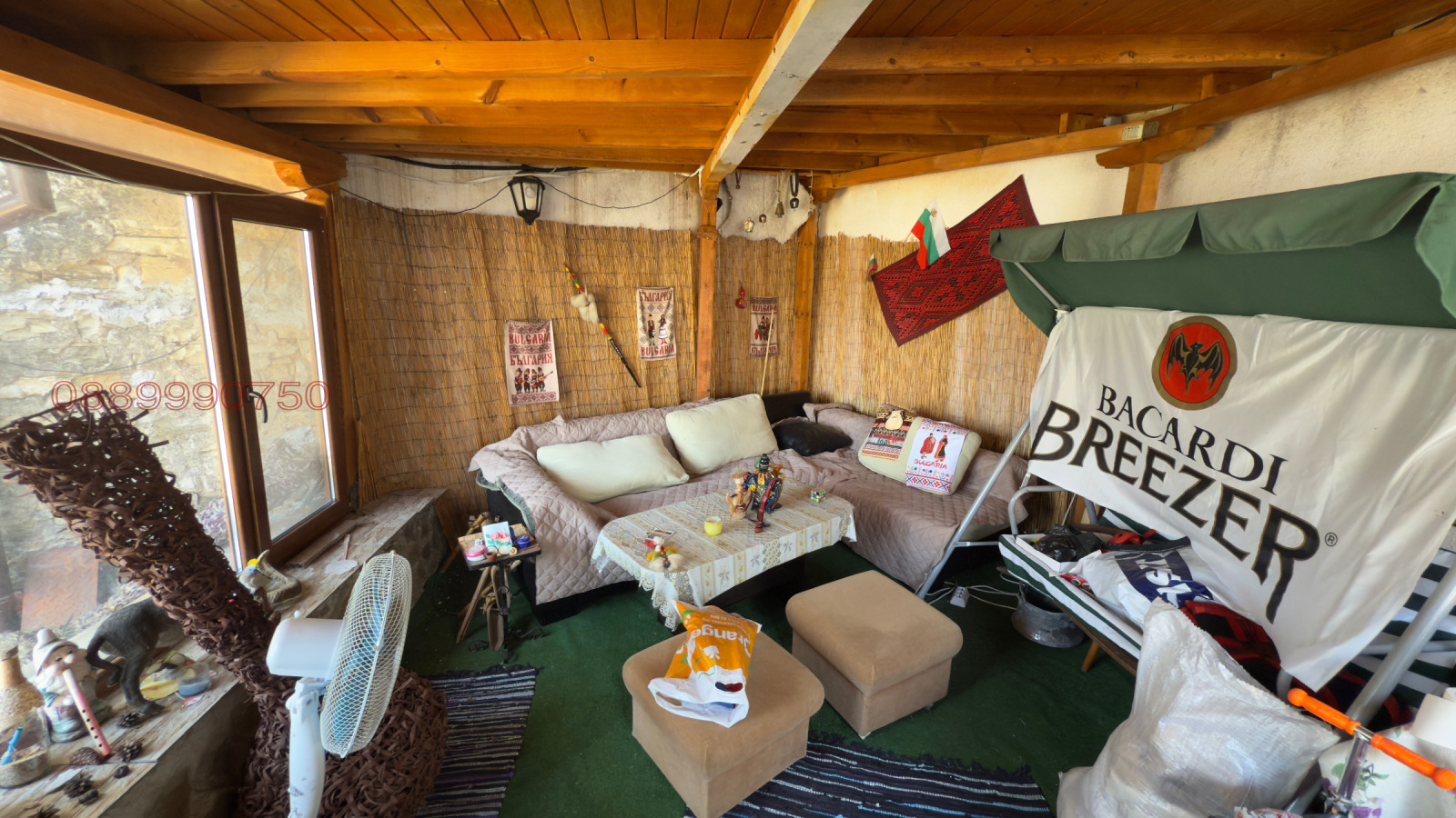 Другата постройка е затворена с дограма ,като там е с ъглов диван 42 инчов тв , маса има и маса за хранене(оформена е като механа)