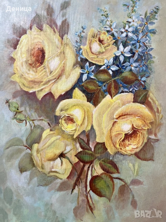 Слънчеви рози и нежни сини звездички Рисувана върху платно, което е изпънато с фазер и защитено → Обява 53490289