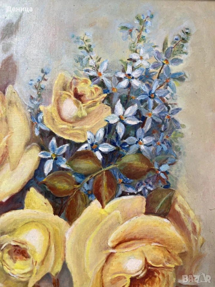 Слънчеви рози и нежни сини звездички Рисувана върху платно, което е изпънато с фазер и защитено