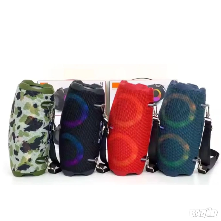 Преносима безжична Bluetooth тонколонка с модерен дизайн, RGB LED осветление около говорителите и дръжка за лесно носене. Подходяща е за домашна употреба, партита, излети и пътуване. Корпусът е устойчив на пръски, което я прави удобна и за външни условия.