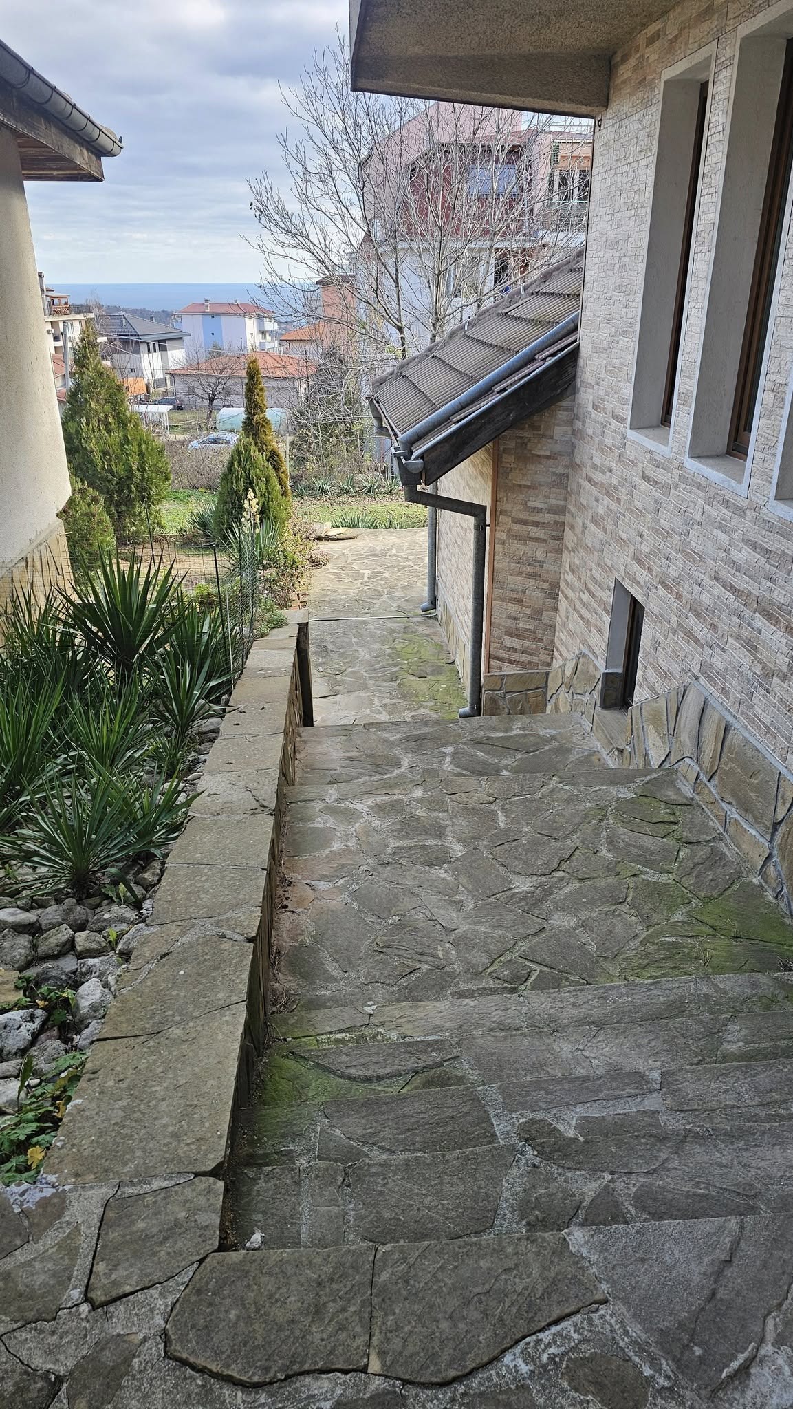 🏡 Разположена в район Виница, на 3 км от курорта Св. св. Константин и Елена и на 7 км от центъра на Варна. Монолитна сграда с три етажа, фасада с камък. Голям гараж и открити паркоместа. Професионално озеленен двор с каменни настилки. Локално отопление, подово отопление и климатик във всяка стая.