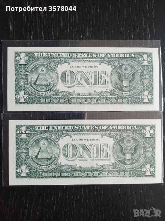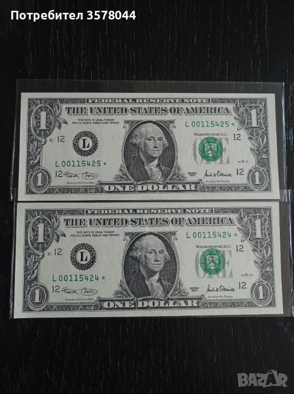 Две колекционерски еднодоларови банкноти със звезда след номера, нециркулирали с поредни номера.