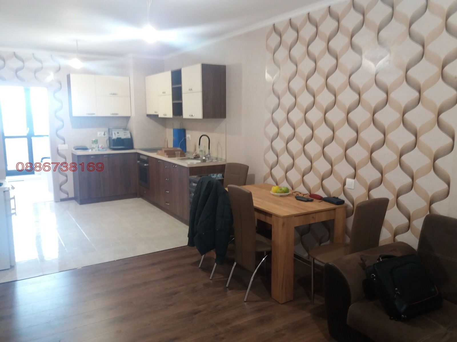Състои се от входно антре, дневна с обзаведен кухненски бокс (котлони, фурна, пералня, хладилник с фризер, абсорбатор, съдомиялна, 50 инчов TV и климатици), спалня с дрешник, баня с тоалетна, две тераси, мазе и собствено паркомясто в задния двор на сградата. Отоплението е с Хиперинверторни климатици от най-висок клас Daikin A+++ на отопление и охлаждане. Апартамента е с ПВЦ дограма с троен стъклопакет и е саниран. Сградата разполага с асансьор. Не се допускат домашни любимци! Отдава се с цел дългосрочно (не за 1-4 месеца). За контакти 0886 73 81 69
