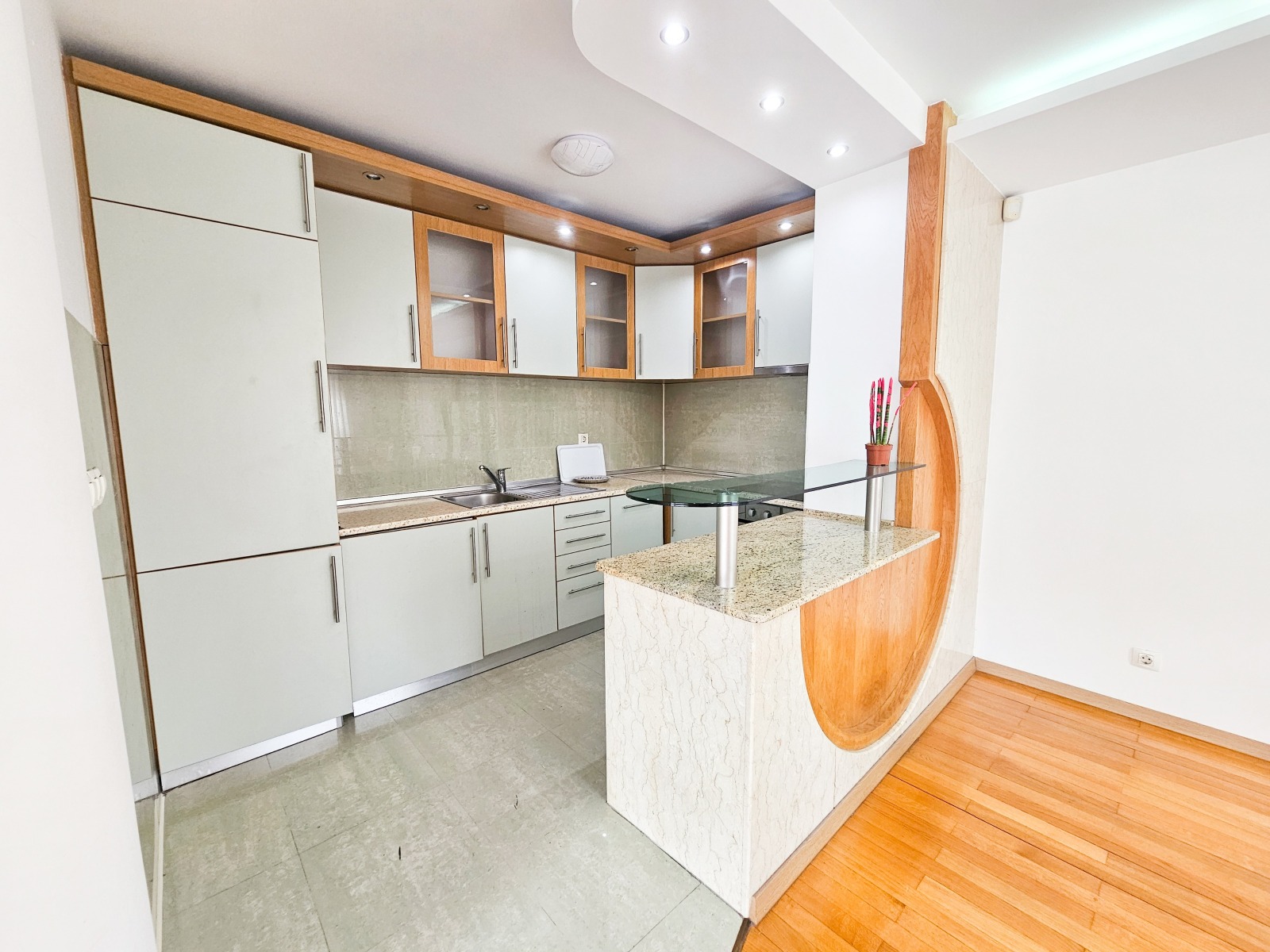 Статут на АТЕЛИЕ! Жилището е завършено до ключ-подовите настилки са гранитогрес, естествен дъбов паркет. Отоплението е решено с електрическо котле, монтирани климатици за охлаждане и отопление, поставено е навсякъде вградено осветление. Входната врата е Solid, вътрешни интериорни врати с естествен дъбов фурнир, дограма- PVC висок клас SHOKO.