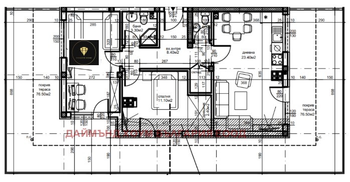 📐Разпределението на апартамента включва коридор, дневна, кухненска част, 2 спални, баня с WC, WC, склад, покрив тераса.