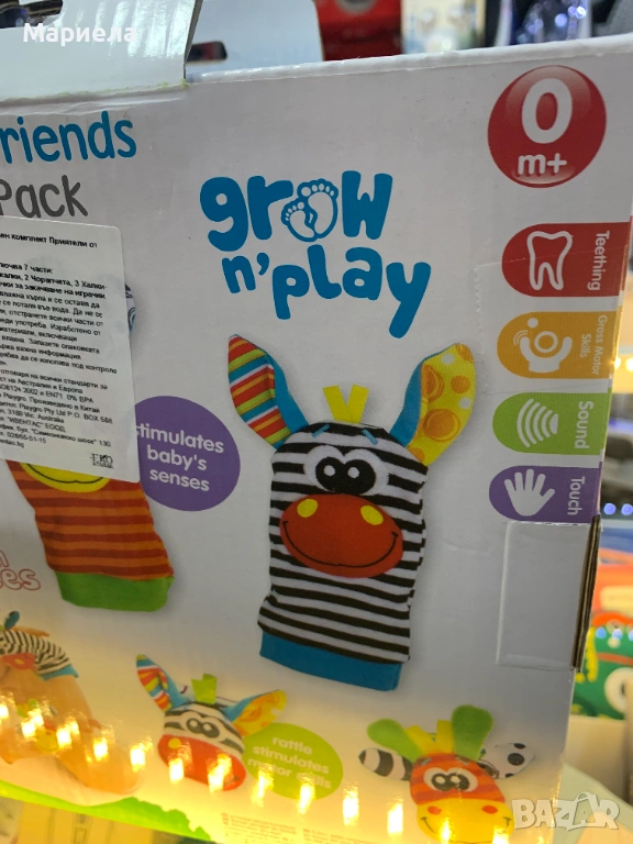 2 дрънкалки за китки, 2 дрънкалки за глезени и 3 гризалки, подходящ за деца от 0 месеца .