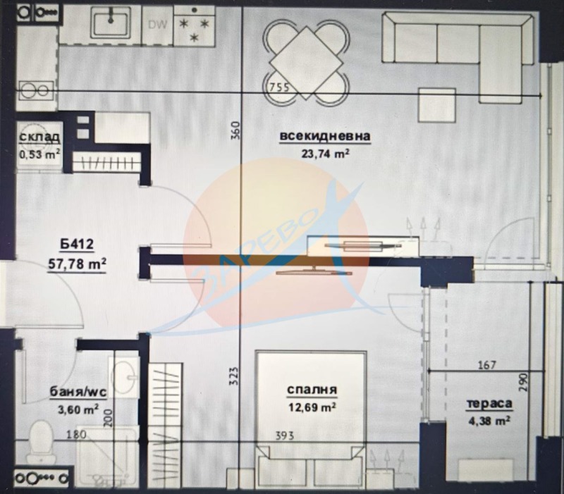 Двустаен апартамент в жилищни сгради *СМОКИНИТЕ 4 Deluxe Residence, Fitness & Spa*, Изгрев, Хоризонт. Апартаментът е двустаен, с квадратура от 66 кв.м, състои се от дневна с кухненски бокс, отделна спалня, балкон, на който се излиза от двете стаи, баня с тоалетна и склад. Апартаментът ще бъде издаден 'на тапа'. Намира се в Секция Б, на 9-ти, последен жилищен етаж, с южно изложение. Разполагаме с апартаменти и с други изложения, същата квадратура. Възможно е закупуването на допълнителен склад на етажа, на цена 6000 евро и на паркоместа, в подземния паркинг на цена от 26 000 евро и открити паркоместа на цена от 17000 евро.