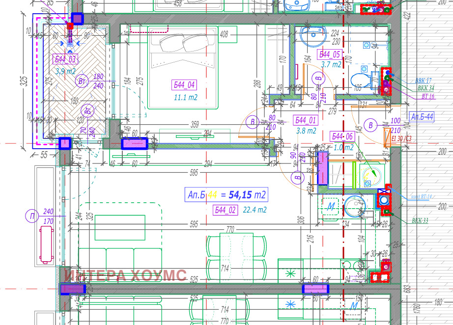- Обща площ - 66.44 кв.м., застроена площ - 54.15 кв.м.;