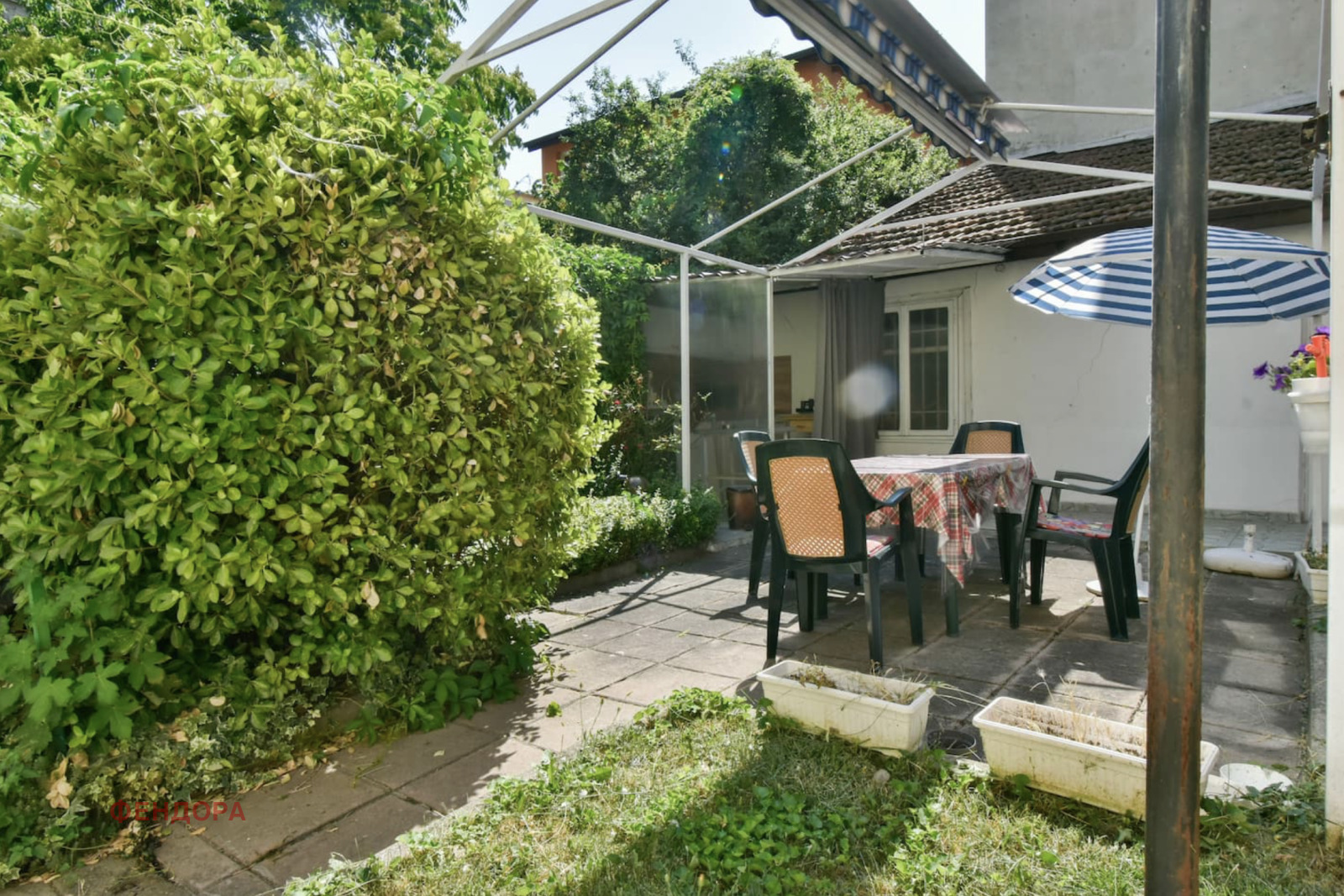 Истинското предимство на този имот е директният и неограничен достъп до вътрешна градина, която се ползва само от този апартамент и имота на горния етаж. Зелената и цветна градина с обособена външна кухня и барбекю зона. Идеална е за приятелски събирания, спокойна закуска на открито или прохладна вечер с чаша вино.