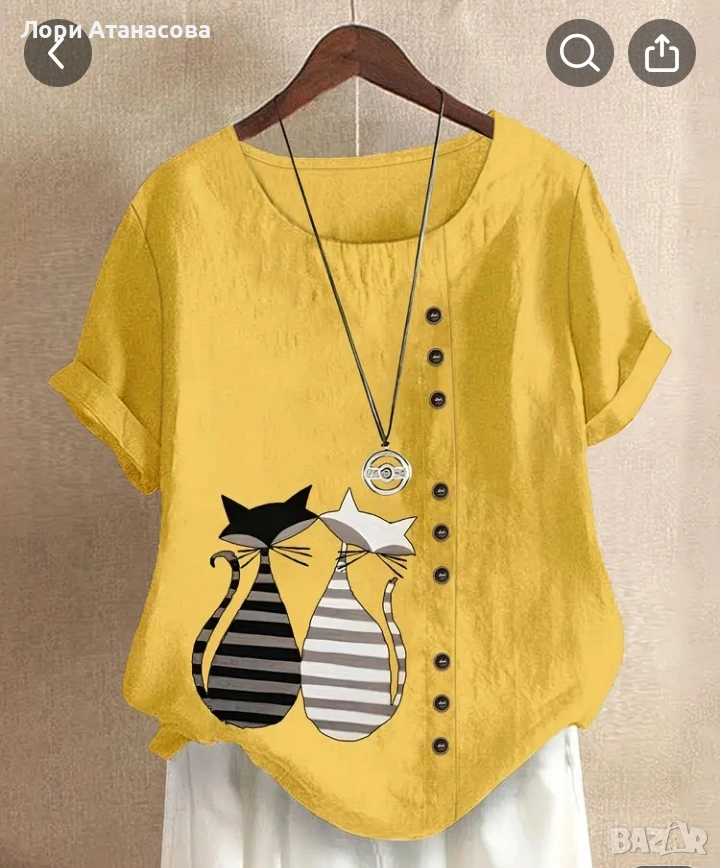 Модерна широка креативна риза с щампа котки, копчета и кръгло деколте → Обява 53492940
