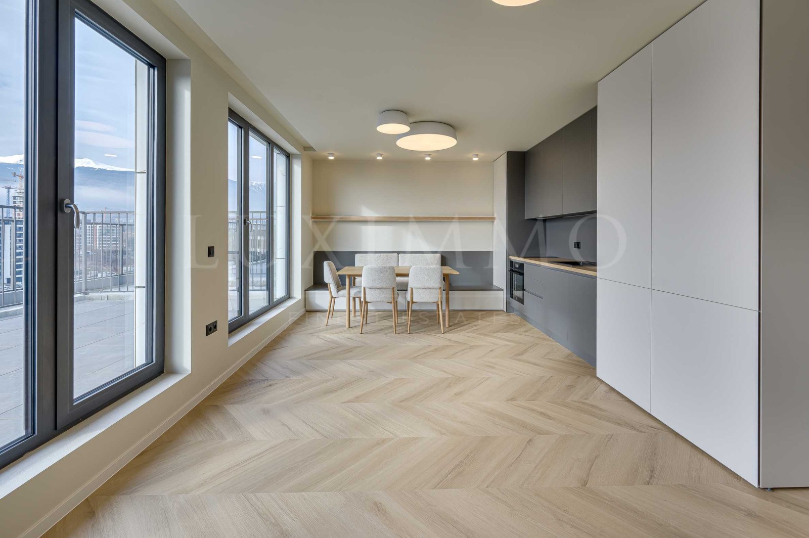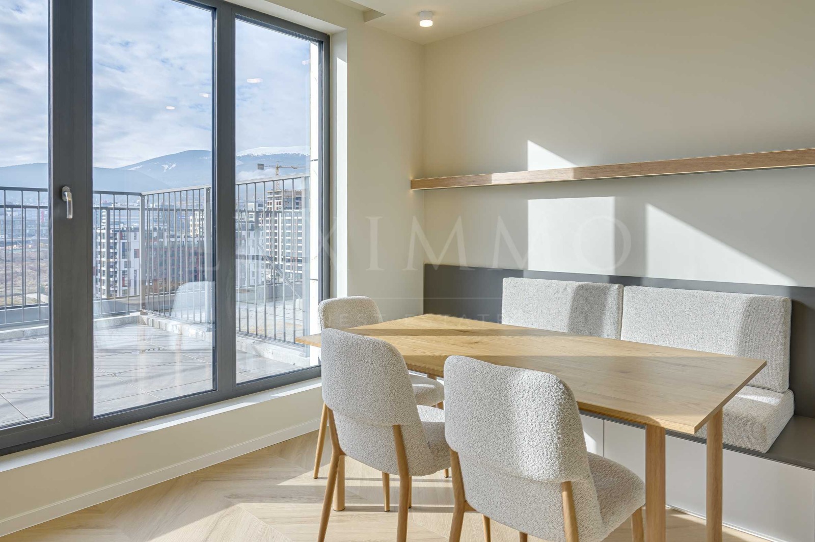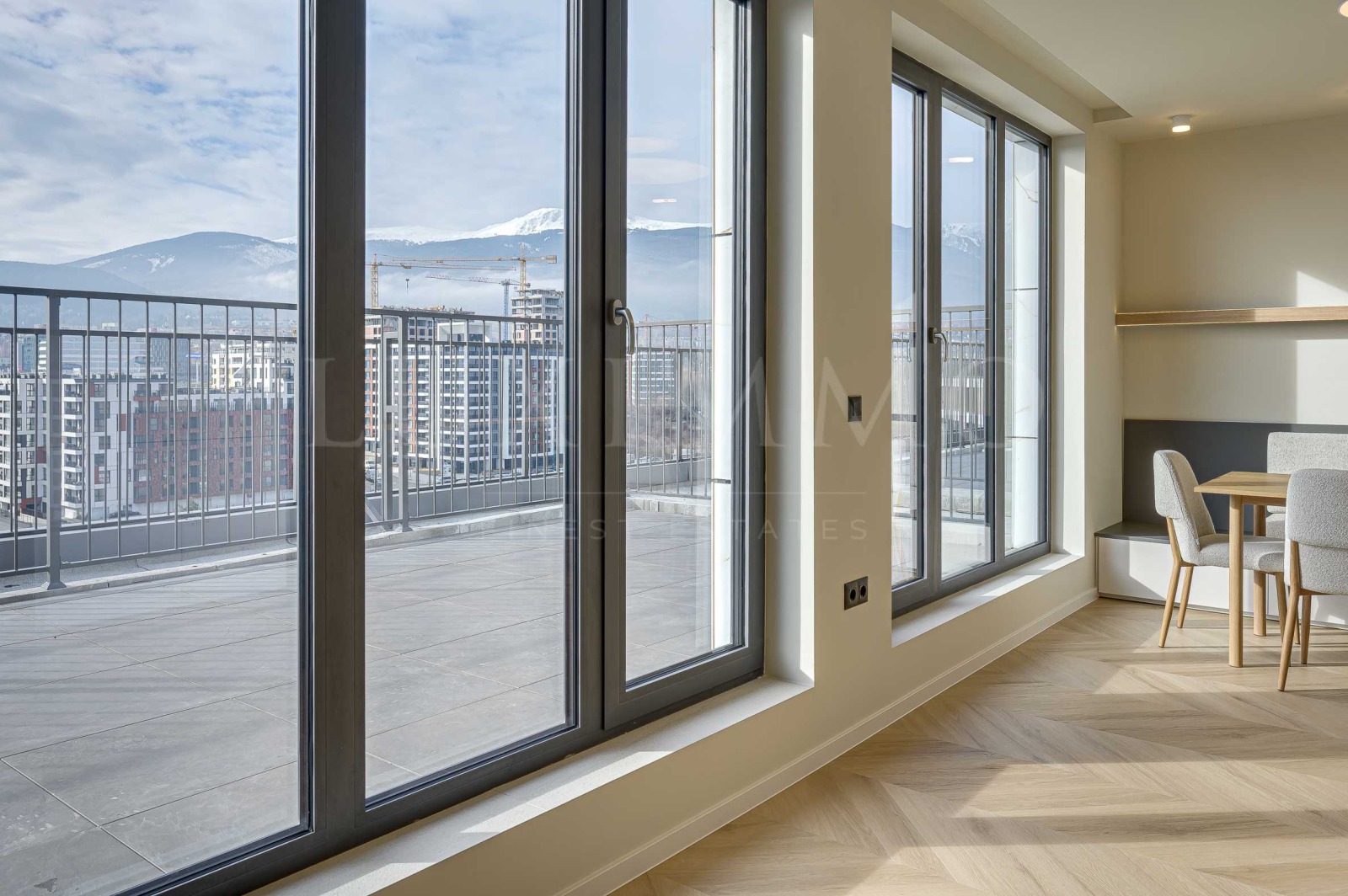Жилището се намира на последния, 10-ти етаж и разкрива впечатляваща, отворена гледка към Витоша и околността без шум от трафик, с изобилие от естествена светлина през целия ден. Просторната панорамна тераса е с елегантна пергола и възможност за обособяване на външен кът за хранене и зеленина естествено продължение на интериора и усещането за живот на открито.