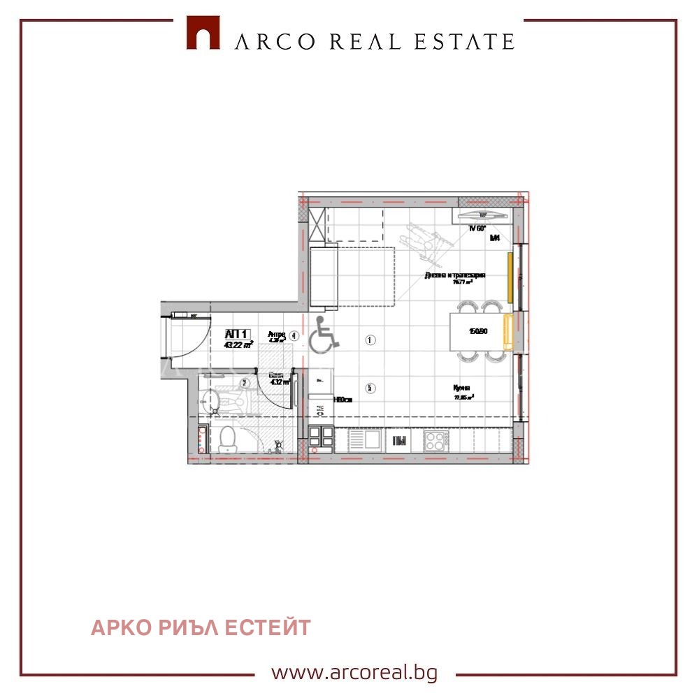 Апартамент 1 - Едностаен апартамент на партере със застроена площ 43.22 кв.м. с източно изложение.
