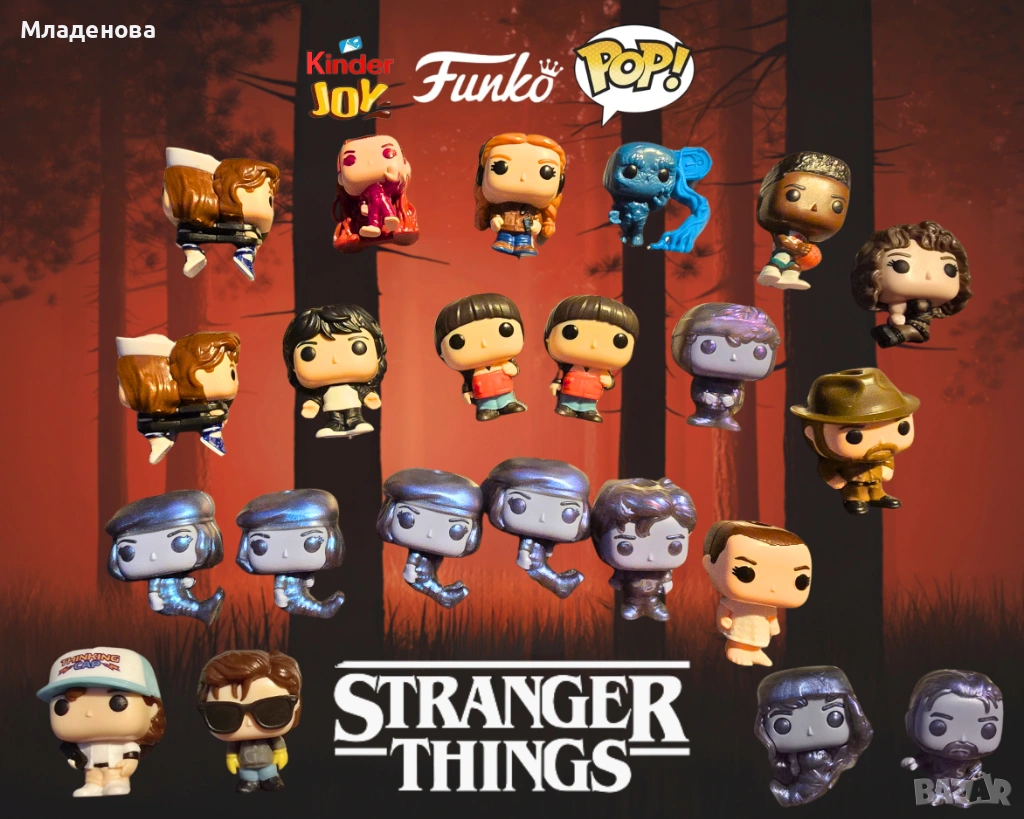Продавам уникална и добре поддържана колекция от Funko Pop фигурки, вдъхновени от култовия сериал Stranger Things. Фигурките са в отлично състояние, част от тях са лимитирани издания и редки варианти. Подходящи са както за колекционери, така и за подарък на фенове на сериала.