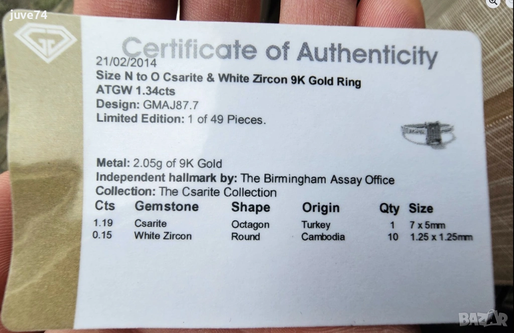 ЗЛАТЕН ПРЪСТЕН С ЕСТЕСТВЕН СУЛТАНИТ (ТУРЦИЯ) СЕРТИФИКАТ