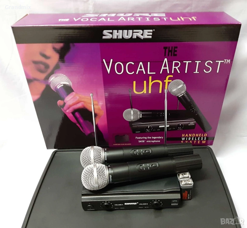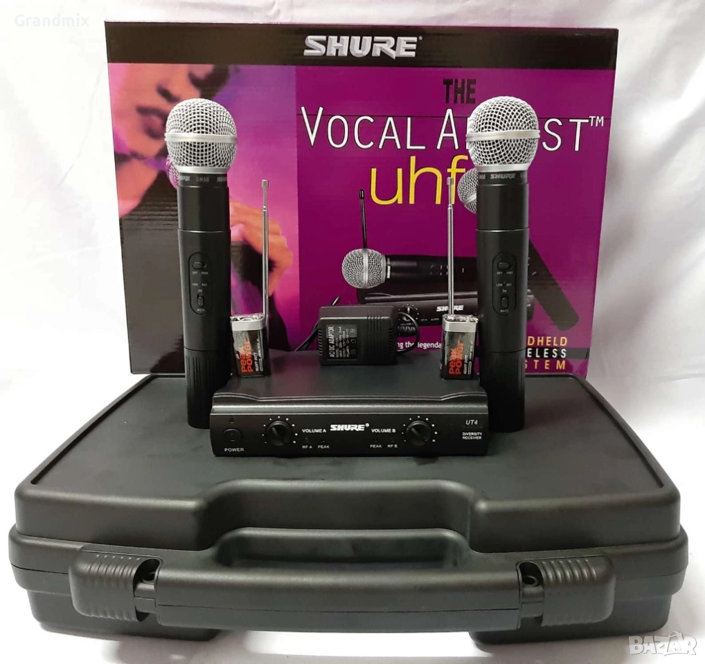 Професионален безжичен микрофон с приемник SHURE SH-200 Характеристики: * Изключително качествен микрофон * Подходящи за караоке и забавления * Работна честота 210-270MHz * Кварцово стабилизиран * Честотен обхват 40Hz-16kHz * Захранване с една 9V батерия * Кабели за включване към смесител с жак - 6,3 мм * Двупозиционен превключвател на корпуса Комплектът съдържа: * Микрофон * Приемник * Батерия 9 Волта * Адаптер-Кабел