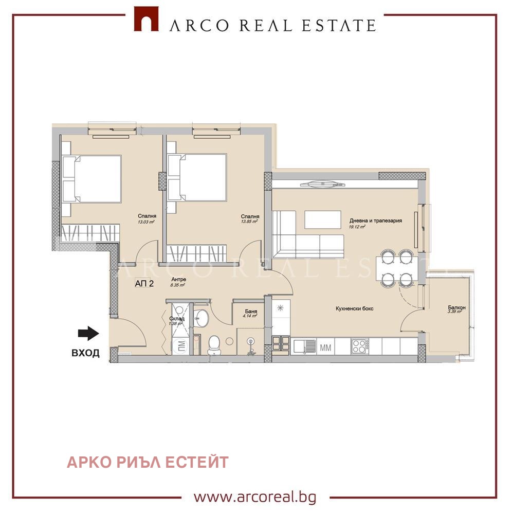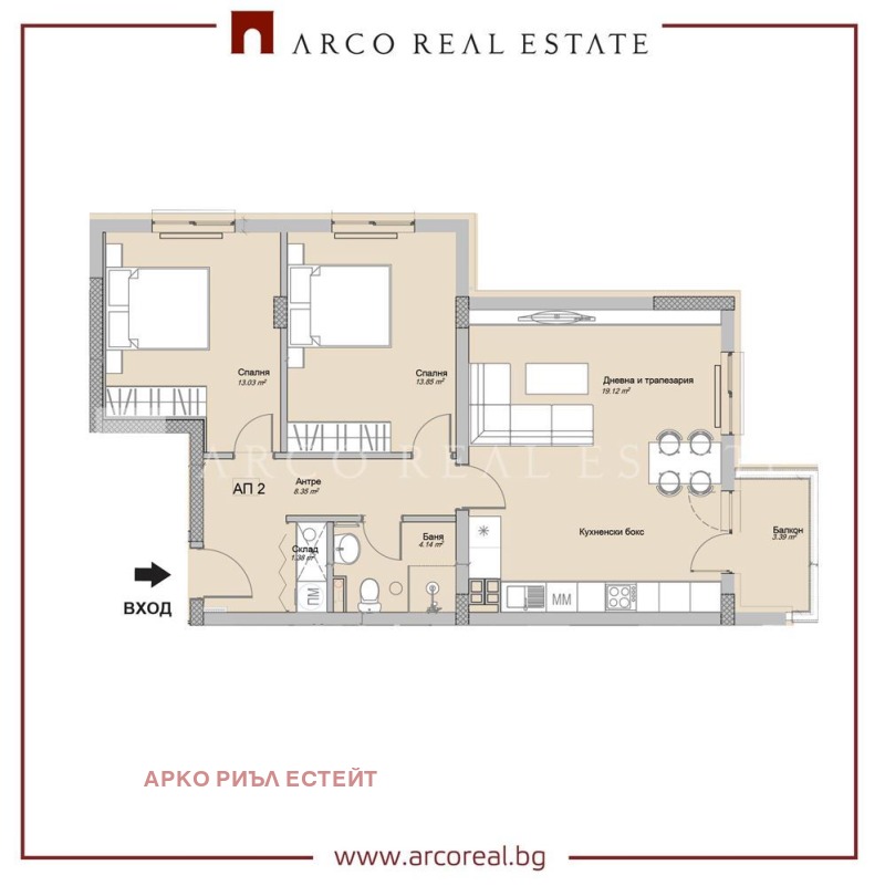 Разпределение: Входно антре, дневна с трапезария / 19.12кв.м./, кухненски бокс светъл с балкон /9.40 кв.м./, 2 спални по 13 в.м./ , баня с тоалетна, склад.