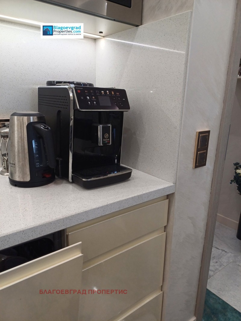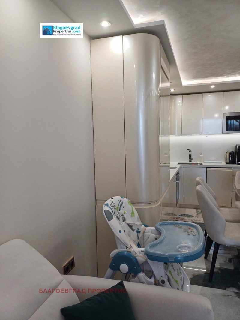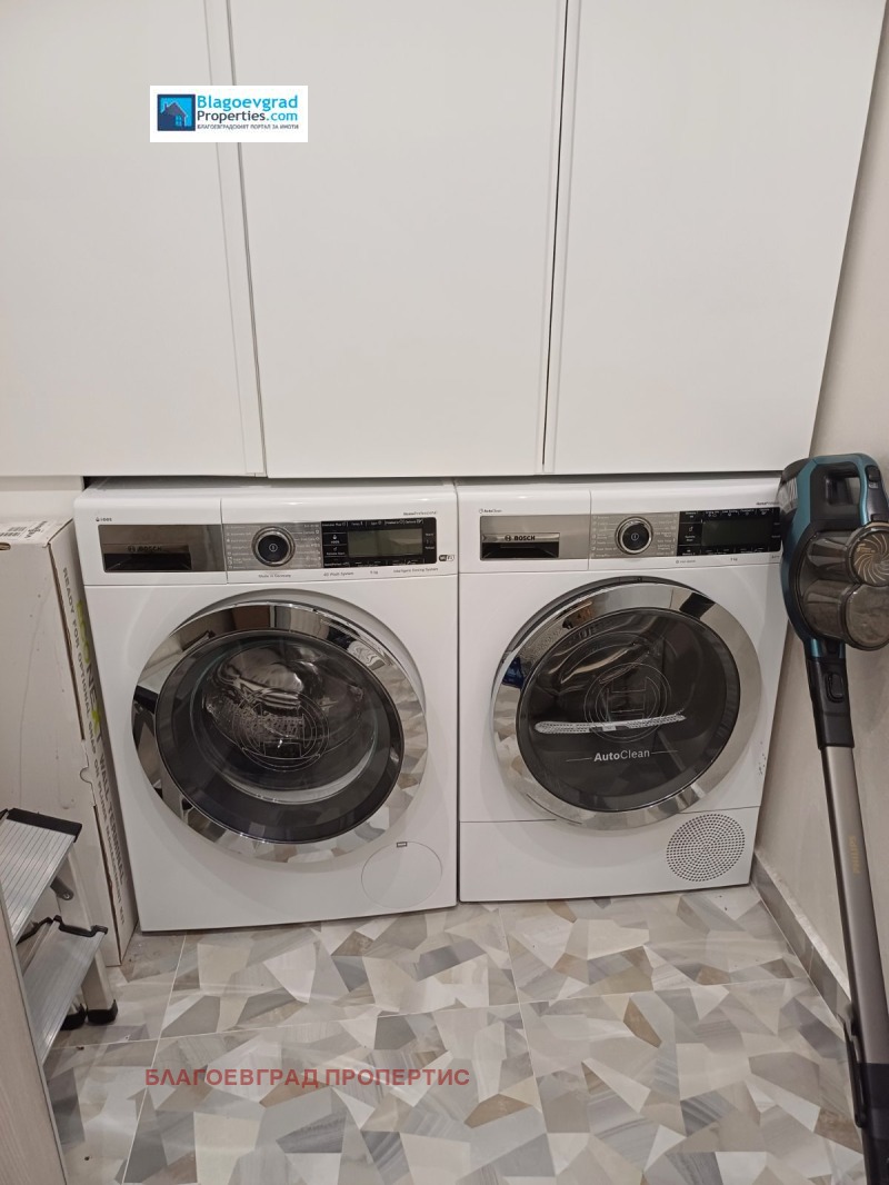Апартаментът е завършен с висококачествени материали и обзаведен с висок клас мебели и уреди: Кухнята е МДФ с вградени уреди, плота с испански пресован гранит. Отоплението е решено с подово работещо на газ /котле Viesmann/. В дневната е поставен климатик Мitsubishi, достатъчен за охлаждането на жилището. Отделно в двете спални има и норвежки конвекторни радиатори. В мокрото помещение - чудесен шкаф за съхранение, пералня и сушилня по 9 кг 'Bosch'. Всички уреди са в гаранция.
