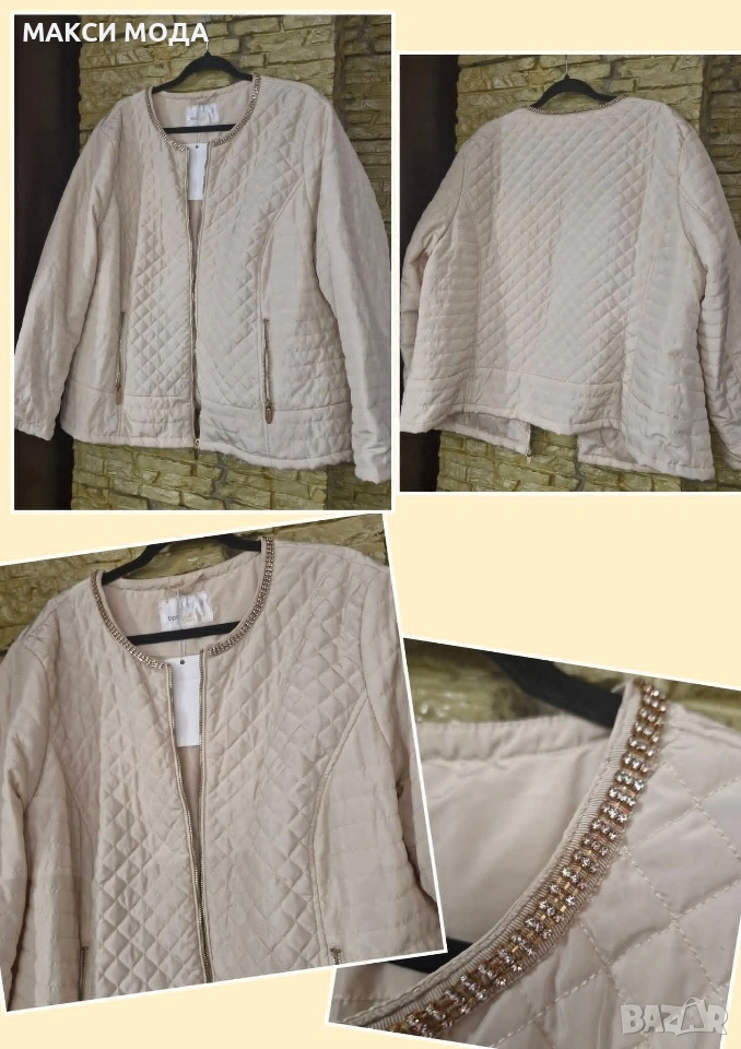 Ново, преходно яке BPC COLLECTION Германия Размер по етикет EU 54, съответства на 4/5ХЛ Цвят бежово С камъчета покрай деколтето Закопчаване с цип Гръдна 144 см Ханш 150 см Бицепс обиколка 48 см Дължина 68 см 29€