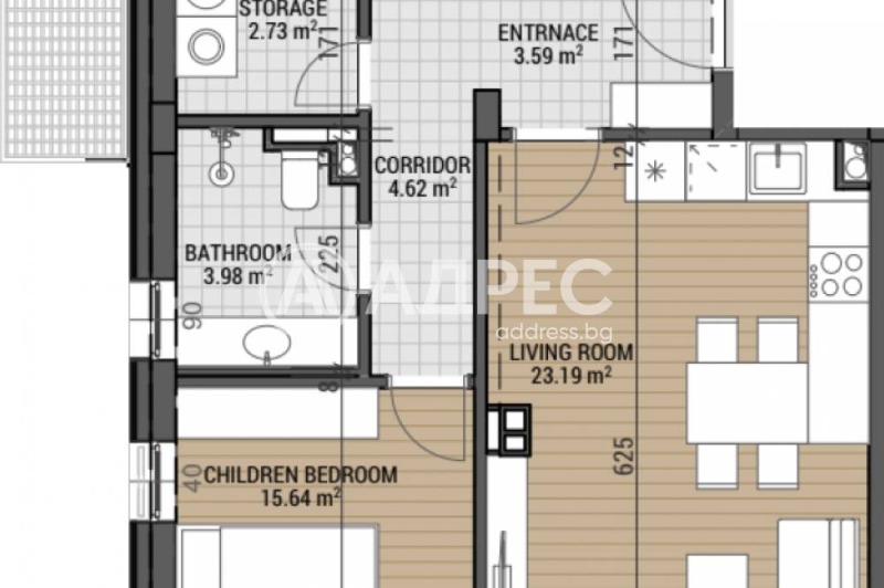 Тристаен апартамент на етаж ВТОРИ със ЗП-97,58 кв.м., РЗП-124,98 кв.м., идеални части от парцела равняващи се на 101,86 кв.м. Разпределение: Дневен тракт с кухня, 2 спални, 2 бани с тоалетни, склад, лоджия. Изложение: Север, Юг, Запад.