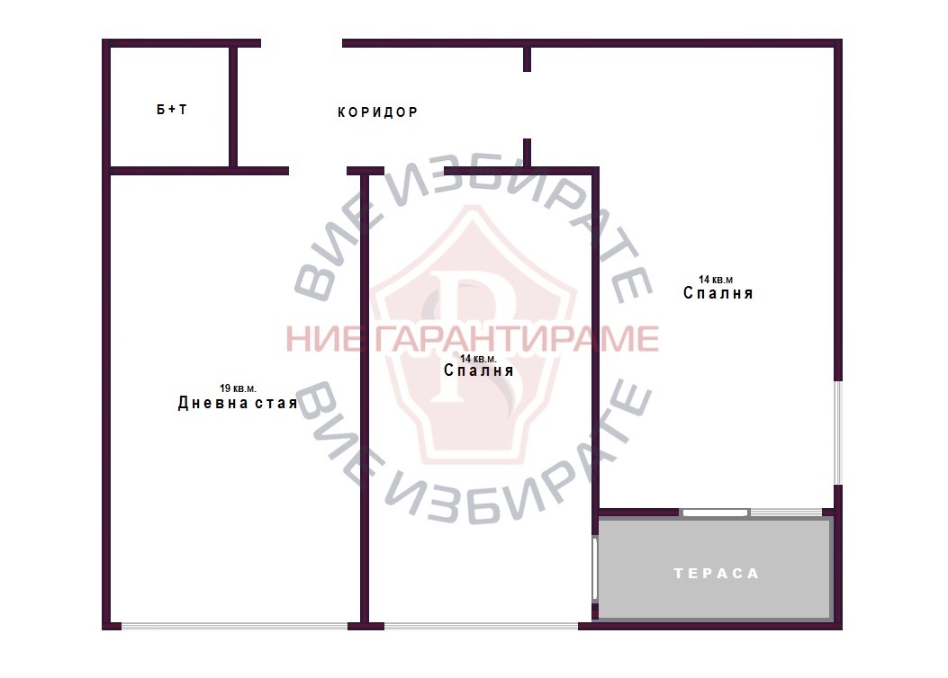 Разпределение: коридор, кухня/трапезария, две спални, баня+тоалетна, ПРОСТОРНА тераса пред трите стаи.