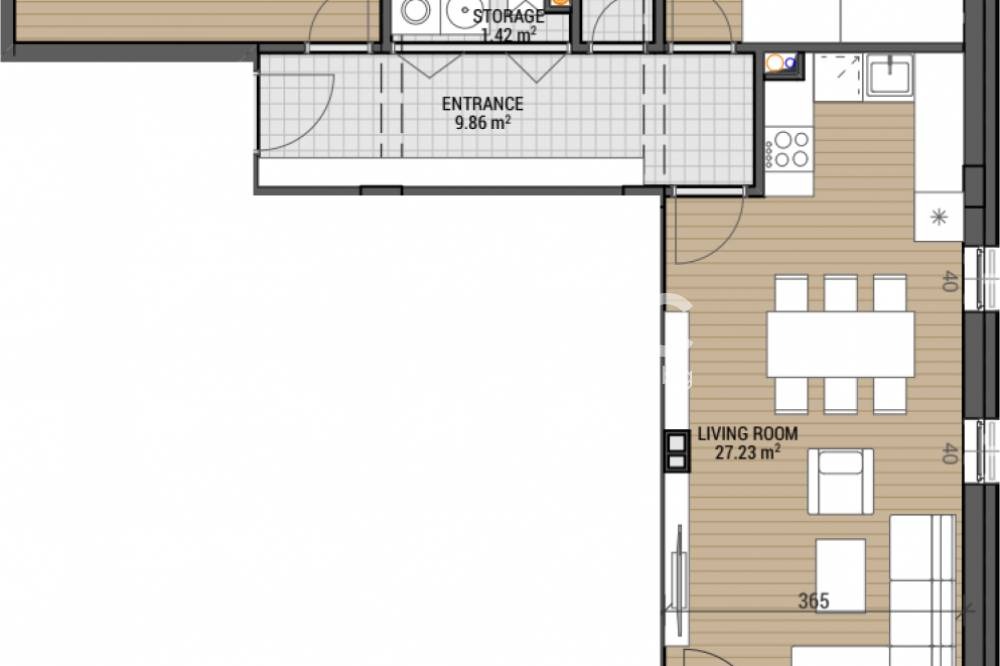 Тристаен апартамент на етаж ТРЕТИ със ЗП-97,58 кв.м., РЗП-124,98 кв.м., идеални части от парцела равняващи се на 101,86 кв.м. Разпределение: Дневен тракт с кухня, 2 спални, 2 бани с тоалетни, склад, лоджия. Изложение: Север, Юг, Запад.