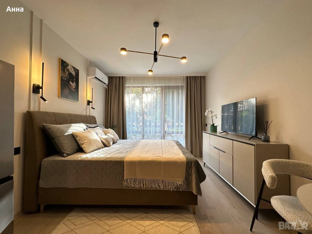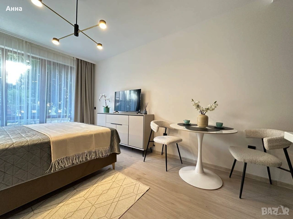 Този апартамент на партерния етаж с директен достъп до вътрешния двор и басейна на комплекса е рядка и удобна опция. Просторна тераса с изглед към палми и цъфтящи магнолии създава усещането за релакс в изискан средиземноморски хотел. Сутрешното кафе, съпроводено от шумолене на листа и мекия морски въздух, ще се превърне във вашето ежедневие тук. Апартаментът е наскоро реновиран, с новобоядисани стени и ламиниран паркет. Интериорът е щателно проектиран до последния детайл: 40-те квадратни метра пространство са организирани функционално, удобно и естетически приятно. Мебелите са напълно обновени, включително легло с ортопедичен матрак, скрин, комплект за хранене, огледален гардероб в коридора и модерни осветителни тела. Нови уреди са готови за употреба: телевизор, климатик, пералня, хладилник и душ.