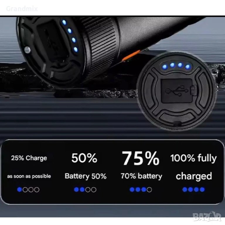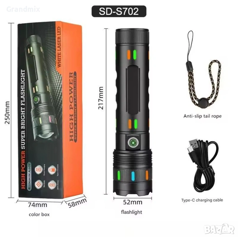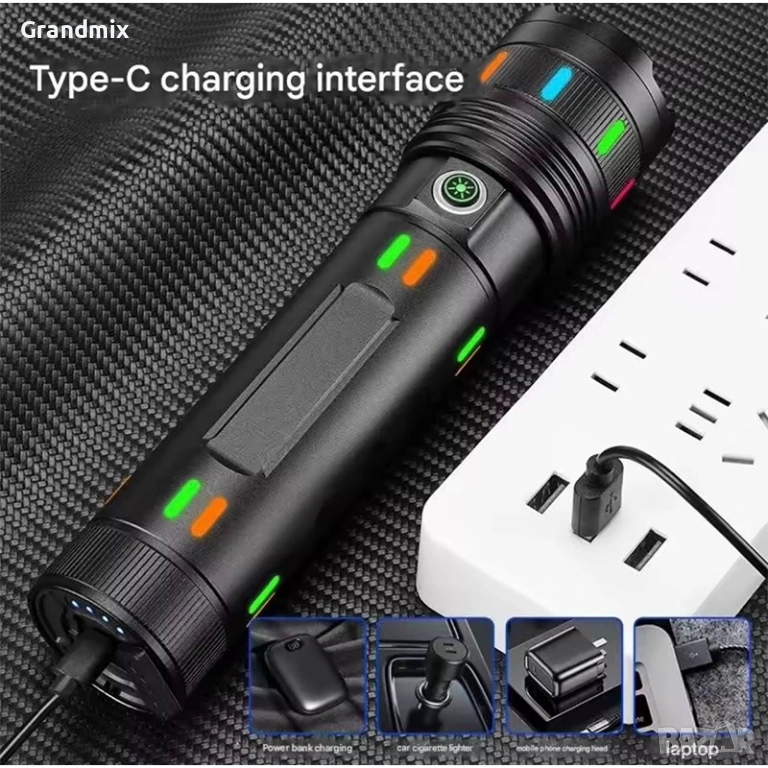 Специални функции, посочени на опаковката: плъзгащ зум, зареждане на телефон, поддръжка на батерия 18650, зареждане тип C