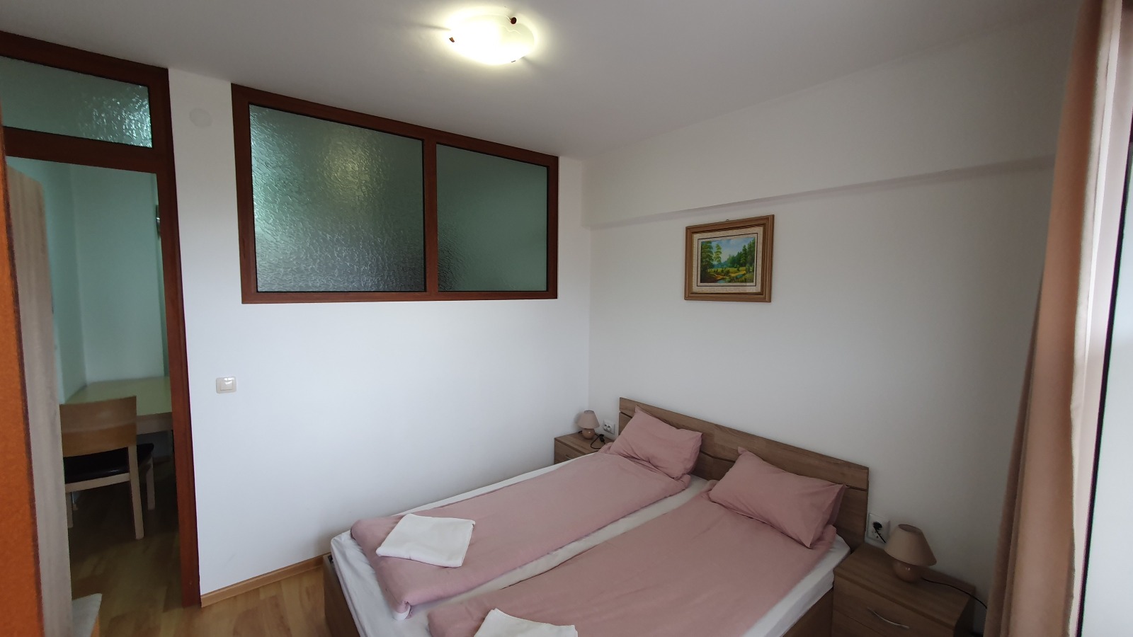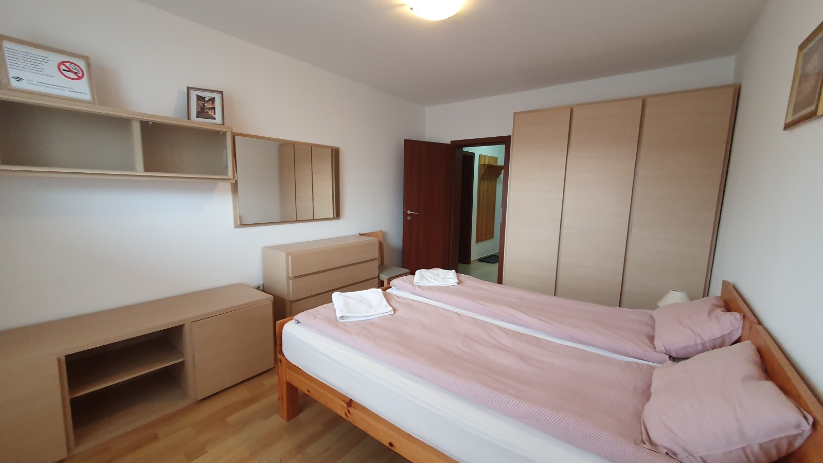 Втората спалня е направена като холът е преграден със стена. Обзаведена е с двойно легло, нощни шкафчета, скрин и гардероб.