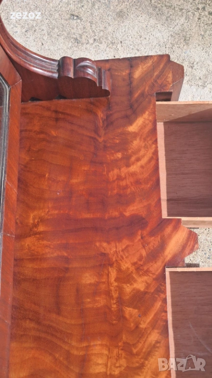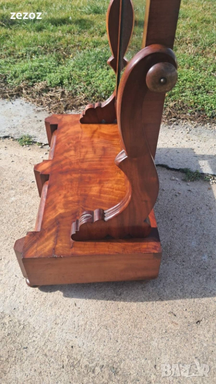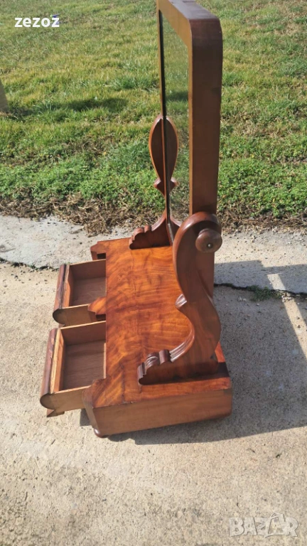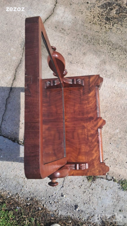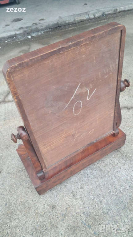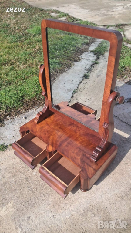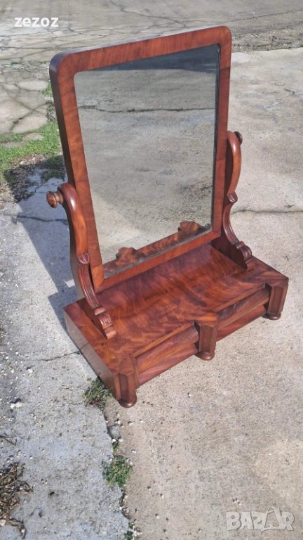 Антикварно тоалетно огледало"Toilet Mirror".Около 1870-1880 г.Подвижно чупещо се рамо.Изработено от масив,покрит с махагонов фурнир"flame mahodany"-пламъчен махагон.За годините си е добре запазено.Има си стари поправки по фурнира на места,както и напуквания,видими на снимките.Размери-
