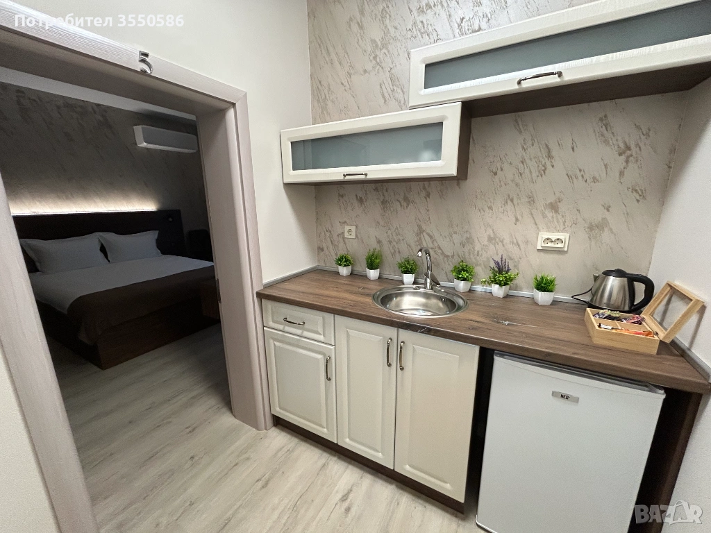 възел с баня и тоалетна. Студиото разполага и с оборудван кухненски