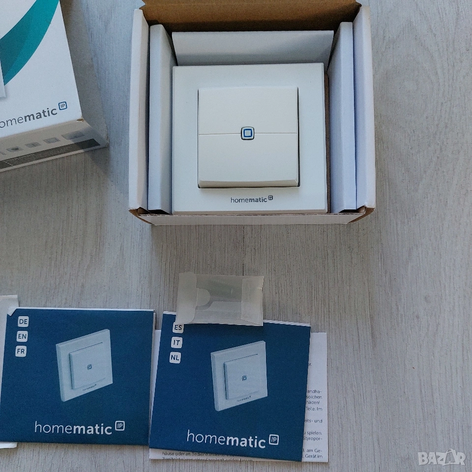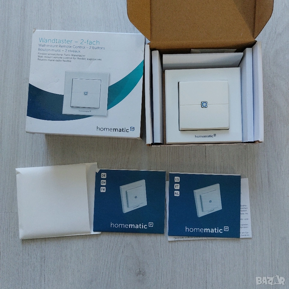 Продавам двоен безжичен стенен превключвател Homematic IP (модел HmIP-WRC2). Устройството е в отлично състояние и е идеалното решение за разширяване на вашата умна домашна система без къртене и окабеляване. Защо този контролер е незаменим? Това не е обикновен ключ, а програмируем контролер, който превръща управлението на дома в удоволствие. С него можете да задействате не просто една лампа, а цели „сцени“. Основни възможности: Пълна персонализация: Всеки от двата бутона разпознава късо и дълго натискане. Това ви дава общо 4 функции от едно устройство (например: Късо натискане = Включи лампа; Дълго натискане = Димирай или изключи всичко). Монтаж без ограничения: Тъй като работи изцяло на батерии, можете да го поставите до леглото, на стъклена витрина или в коридора, без да прекарвате кабели. Монтира се със самозалепващи ленти (включени) или винтове. Интеграция в интериора: Дизайнът е стандартен (55 мм). Ако не искате да ползвате приложената рамка, можете да го вградите в съществуващата ви серия ключове (съвместим с Berker, Gira, Merten, Jung и др.). Надеждност: Използва собствена честота (868.0-868.6 MHz), което означава, че няма смущения от Wi-Fi мрежата ви и командите се изпълняват мигновено. Технически спецификации: Захранване: 2 x 1.5V LR03/Micro/AAA (изключително икономичен – живот на батериите до 4 години). Радиус на действие: До 200 метра (на открито). Размери: 86 x 86 x 16 мм (с рамката). Степен на защита: IP20. Важно за купувача: За работа е необходим Homematic IP Access Point или централа CCU2/CCU3.