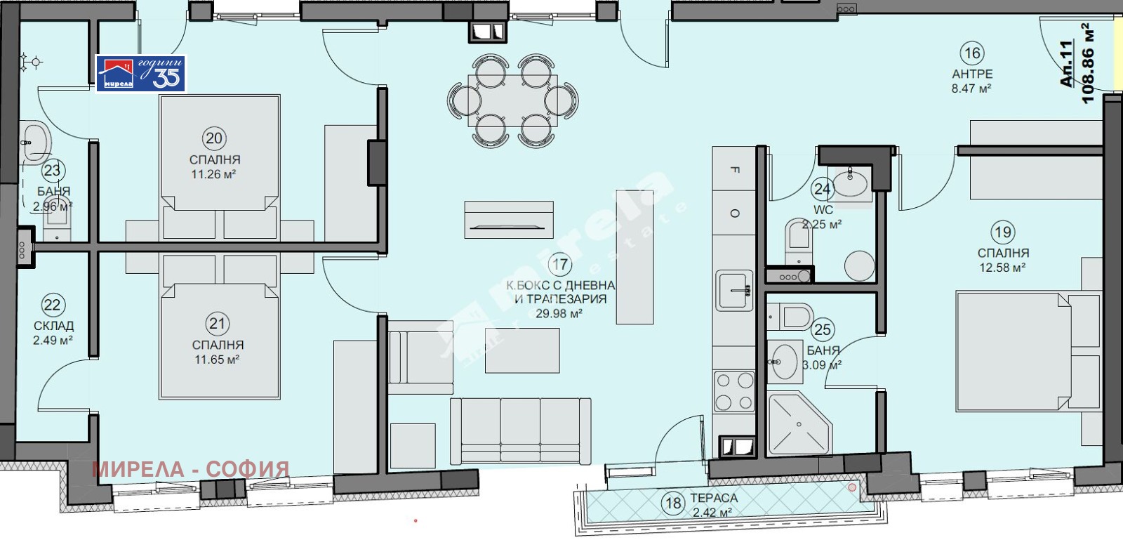 Апартамент 11 е със следното разпределение: антре, дневна с кухненски бокс и трапезария, три спални, две бани с тоалетна, тоалетна, склад и тераса.