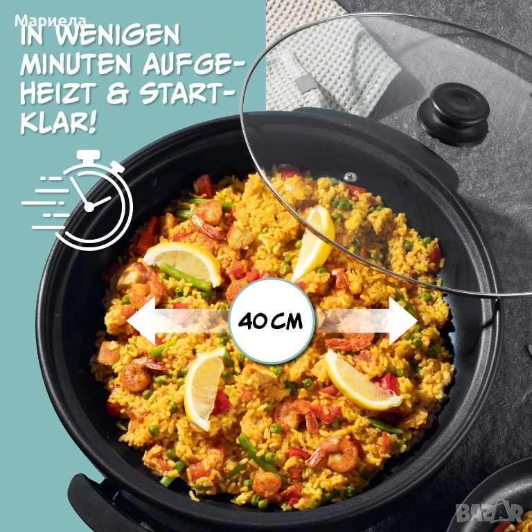 Този уред може не само да пържи, но е чудесен и като тиган за паеля, грил за маса, тенджера за готвене или дори като електрическа фурна за пица.