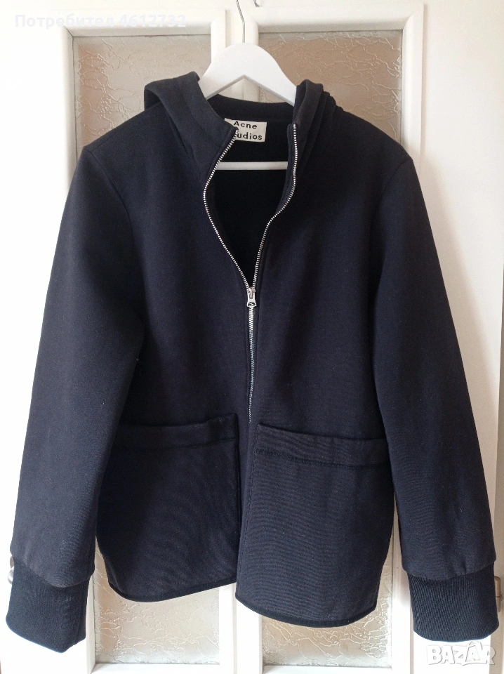Чернен суитчер Acne Studios. Цип в сребристо.Големи квадратни джобове.Памук,полиестер.Размер М. Без забележки.