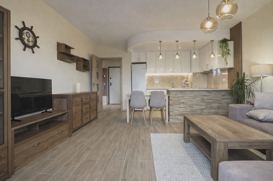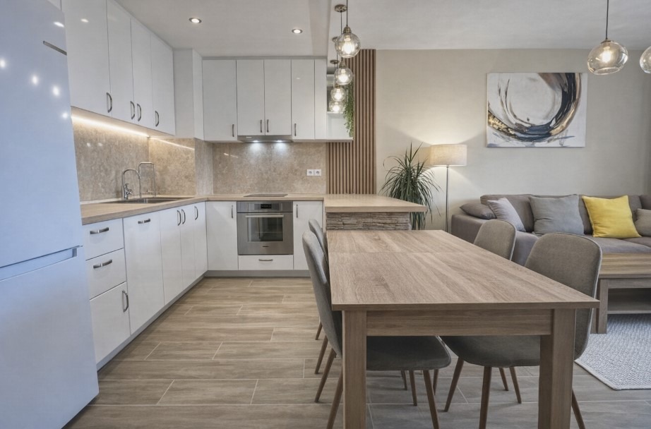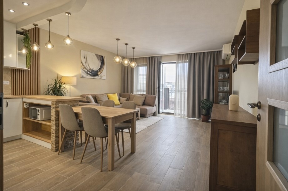 Имотът е обзаведен, с площ 71 кв.м, на 8-ми етаж от 12 етажна сграда с асансьор. Разпределението включва входно антре,просторна дневна с кухня и трапезария, спалня, баня с тоалетна, мокро помещение и тераса.