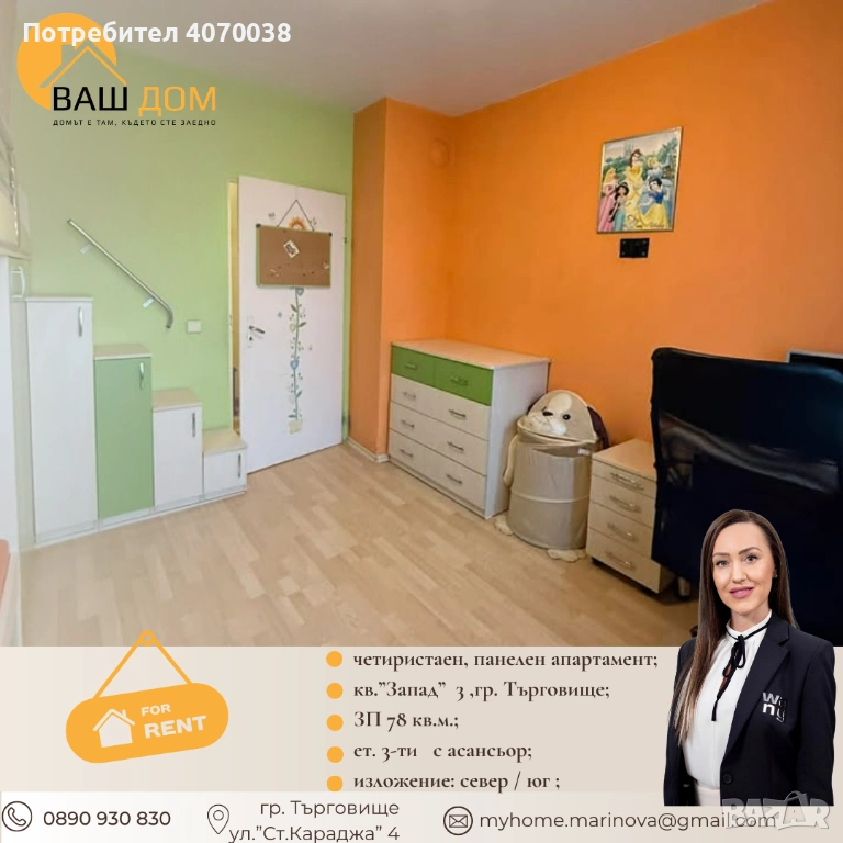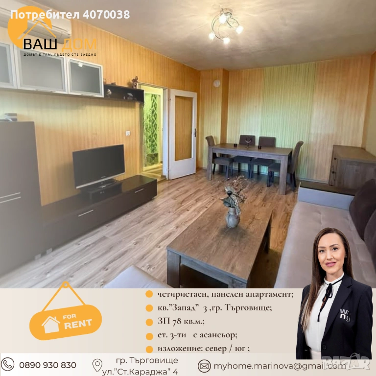 Представяме Ви ПОД НАЕМ четиристаен, панелен апартамент;