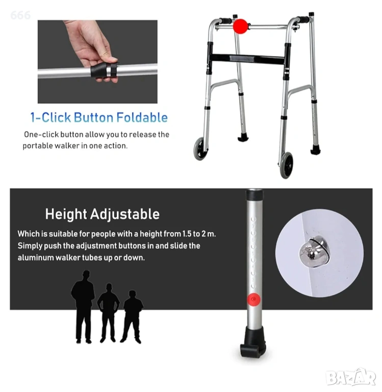 ЗДРАВА И СТАБИЛНА: Проходилката е изработена от висококачествена алуминиева сплав, лесна за почистване и отговаря на строги стандарти за товароносимост до 100 кг/220 фунта.