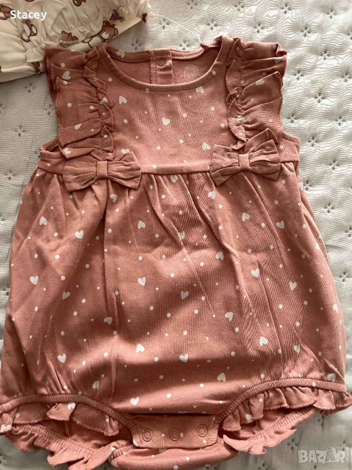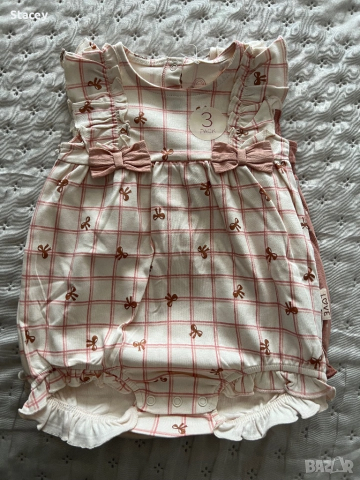 Комплектът включва три различни десена – каре с панделки, мече и сърчица. Мека и приятна материя, удобни копчета отдолу за лесна смяна на памперс. Подходящи за пролет/лято.