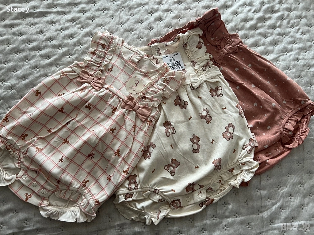 Продавам комплект от 3 броя нови бебешки дрехи (ромпъри), размер 6–9 месеца.