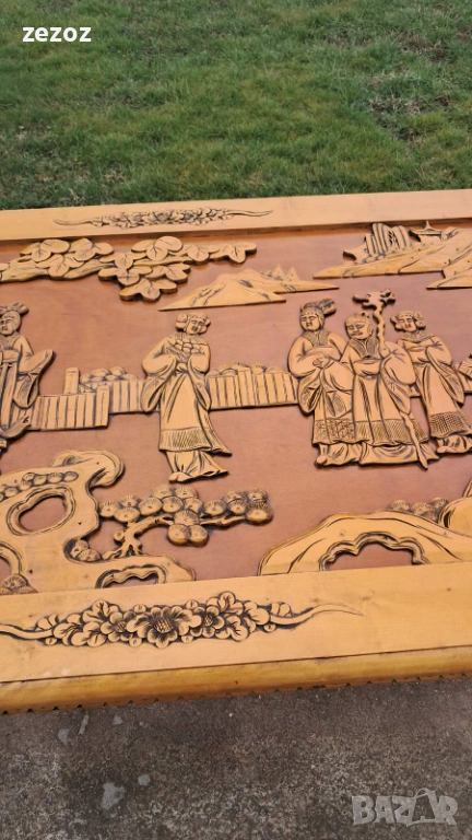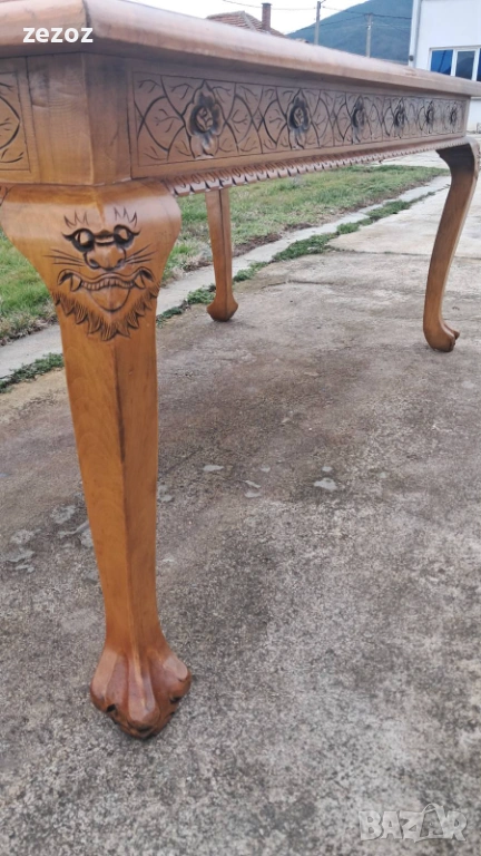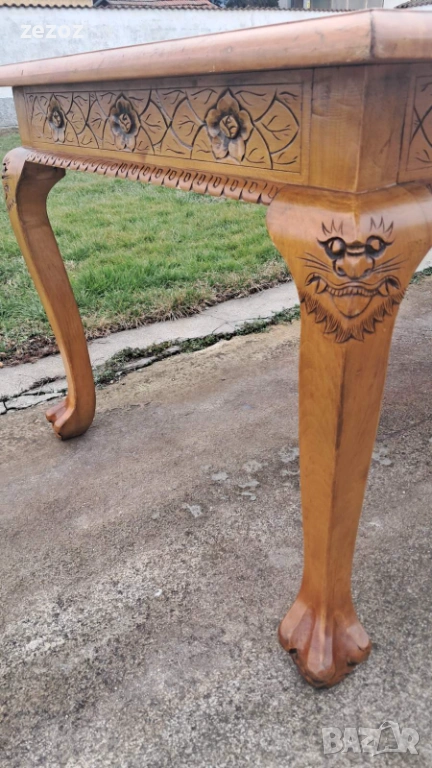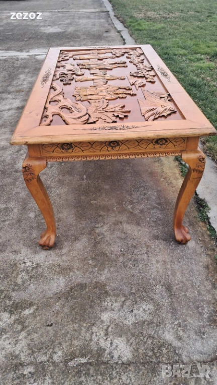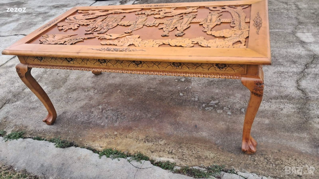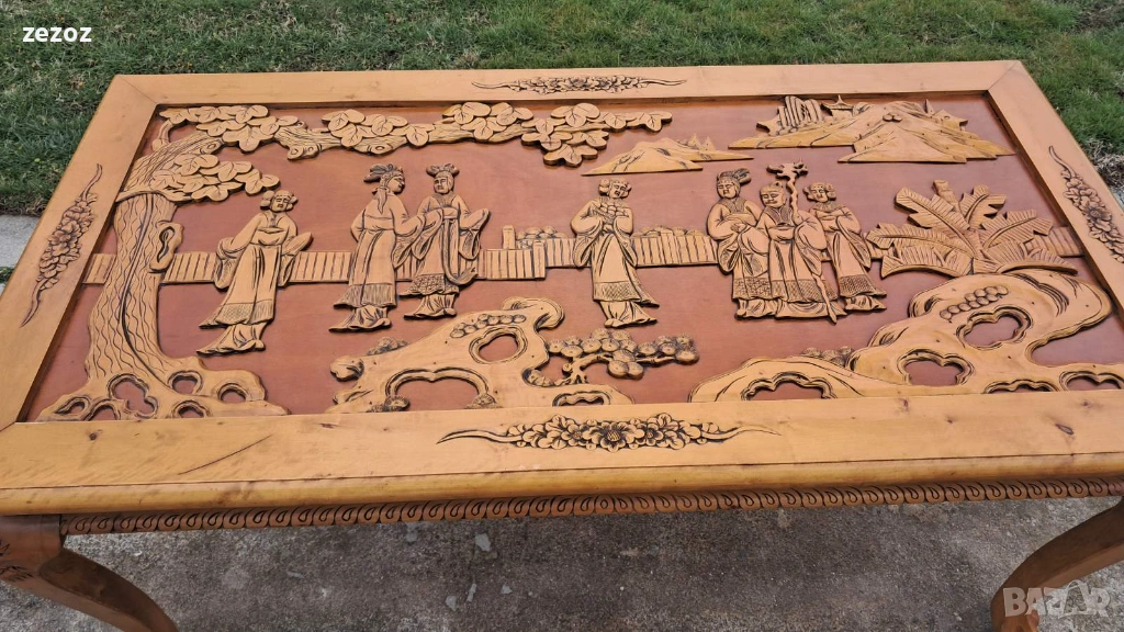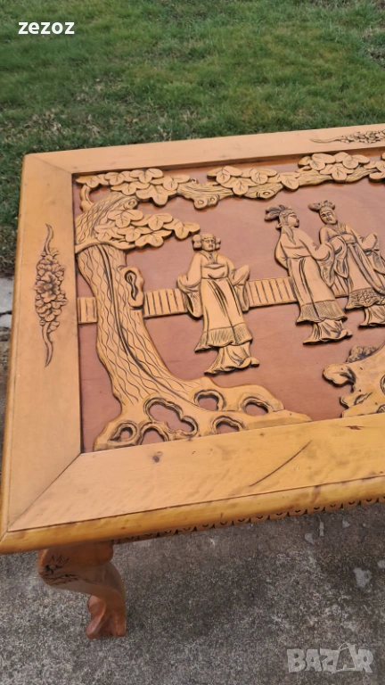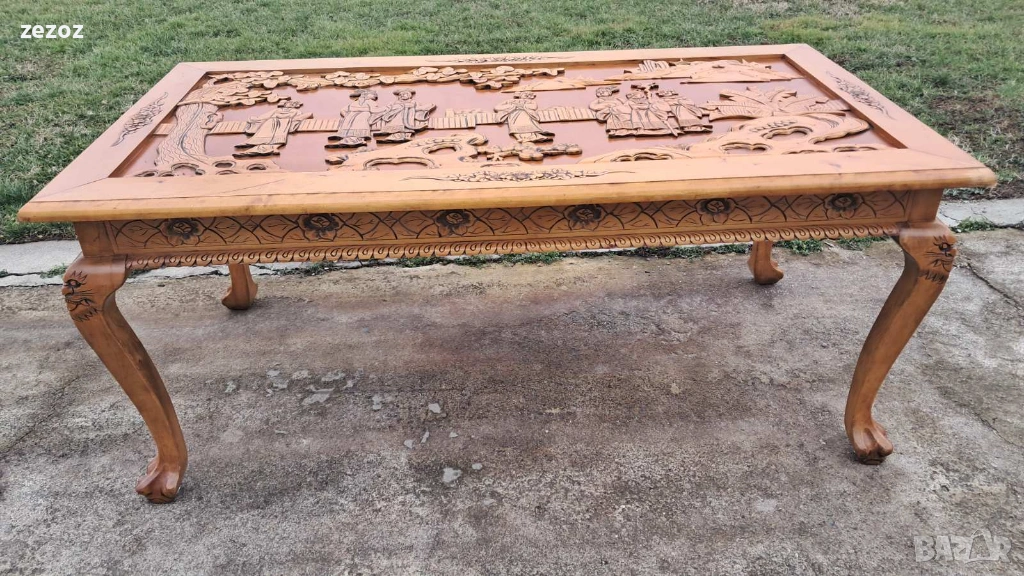 Ретро трапезна маса изработена в азиатски стил от масив.Плот богато украсен с триизмерни азиатски сцени.Кабриолни крака завършващи в стил "Чипъндейл"Могат да се свалят.Масата си има нормални забележки.Липсва стъклото на плота.Само лично предаване.Размери-