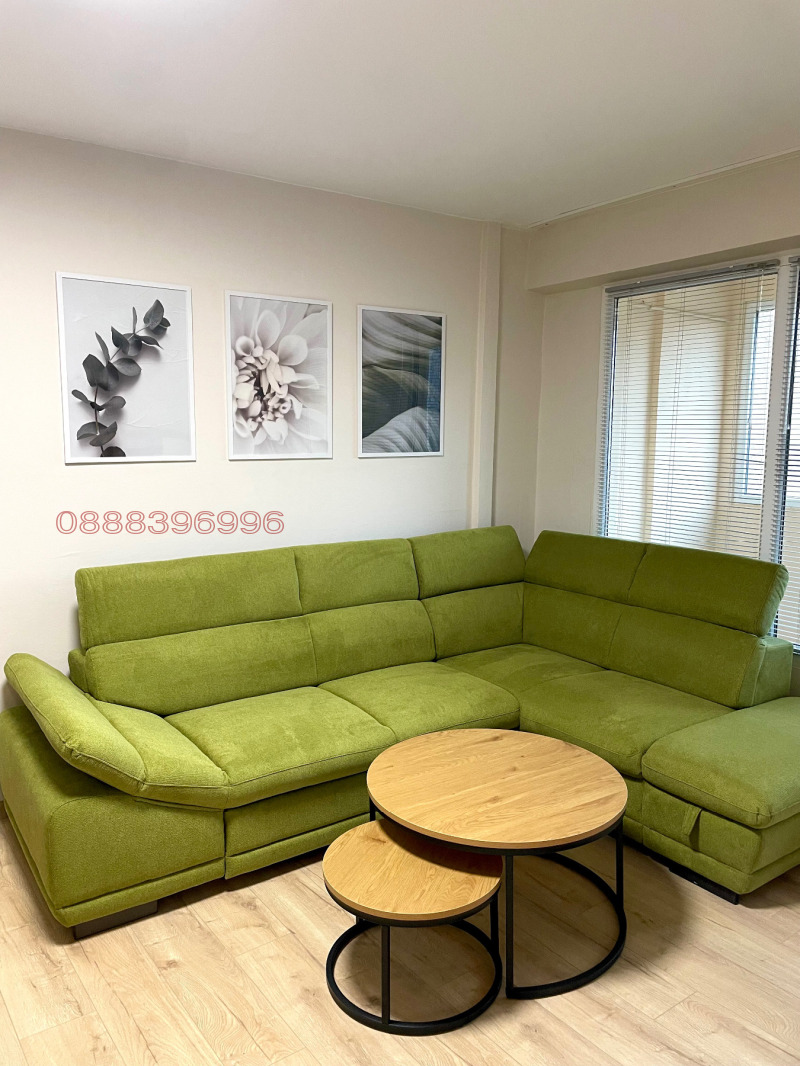 Мебелите са чисто нови. В дневната са разположени комфортен разтегателен диван, холна маса, трапезна маса със столове и секция.