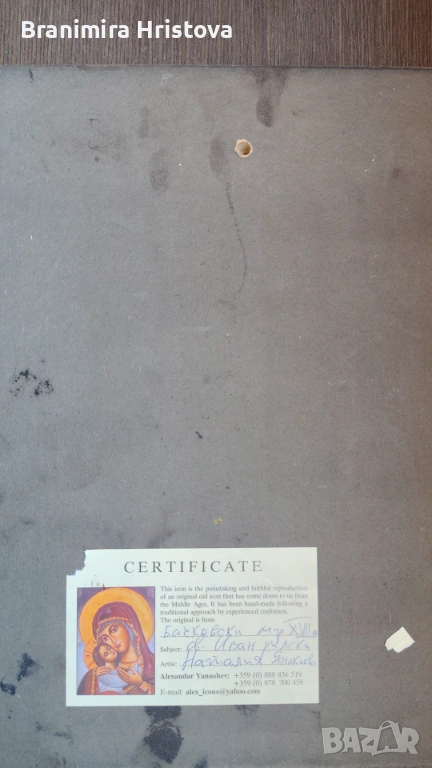 Продавам красива православна икона на Св. Иван Рилски, изработена върху дървена основа. Към нея има сертификат (видим на снимките). Подходяща е за подарък, за дом/офис или молитвен кът.