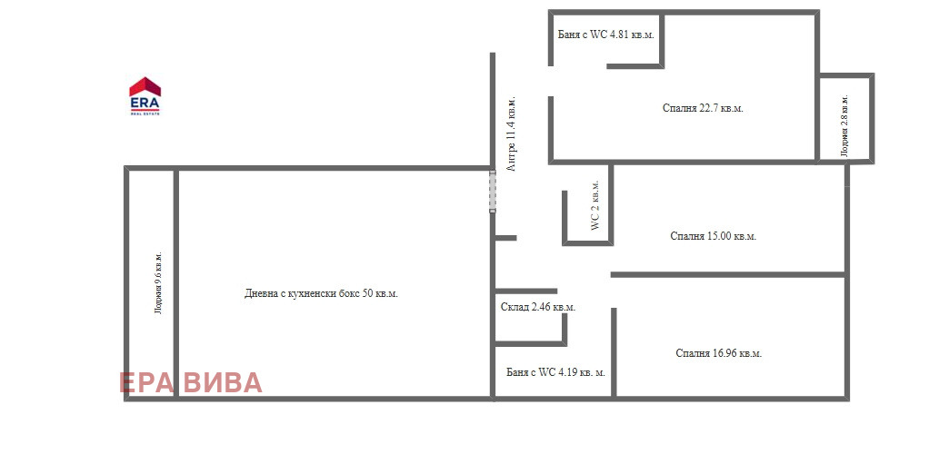 ЕРА Вива София продава просторен и слънчев четиристаен апартамент в района на метростанция 'Витоша' и 'Парадайс мол' в кв. Хладилника, гр. София. Предлаганото жилище е с площ 186.41 кв.м / 163.38 кв.м. застроена площ /. Разположено е на шести етаж от общо единадесет. Състои се от: антре /11.39 кв.м./, дневна с кухн.бокс / 50.70 кв.м./, спалня / 15.00 кв.м. /, втора спалня / 17.00 кв.м. /, трета спалня / 22.20 кв.м. / с прилежаща баня с WC / 4.81кв.м. /, втора баня с WC / 4.19 кв.м. / скл. помещение / 2.46 кв.м./, лоджия /9.60 кв.м./ и балкон /2.79кв.м./. За повече информация вж. раздел План . Изложението е юг/север. Има възможност за закупуването на външни или подземни паркоместа.
