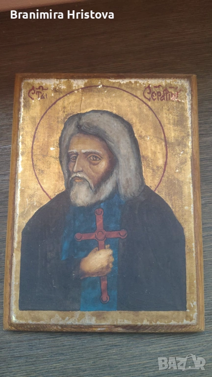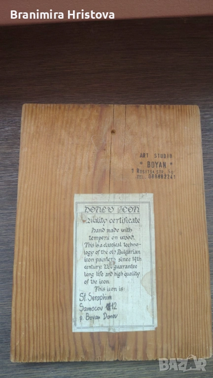 Продавам православна икона „Св. Серафим“, ръчна изработка – темпера върху дърво. На гърба има сертификат за качество и печат на Art Studio “Boyan” / Boyan Donev (както се вижда на снимките). Иконата е в самоковски стил (отбелязано в сертификата).
