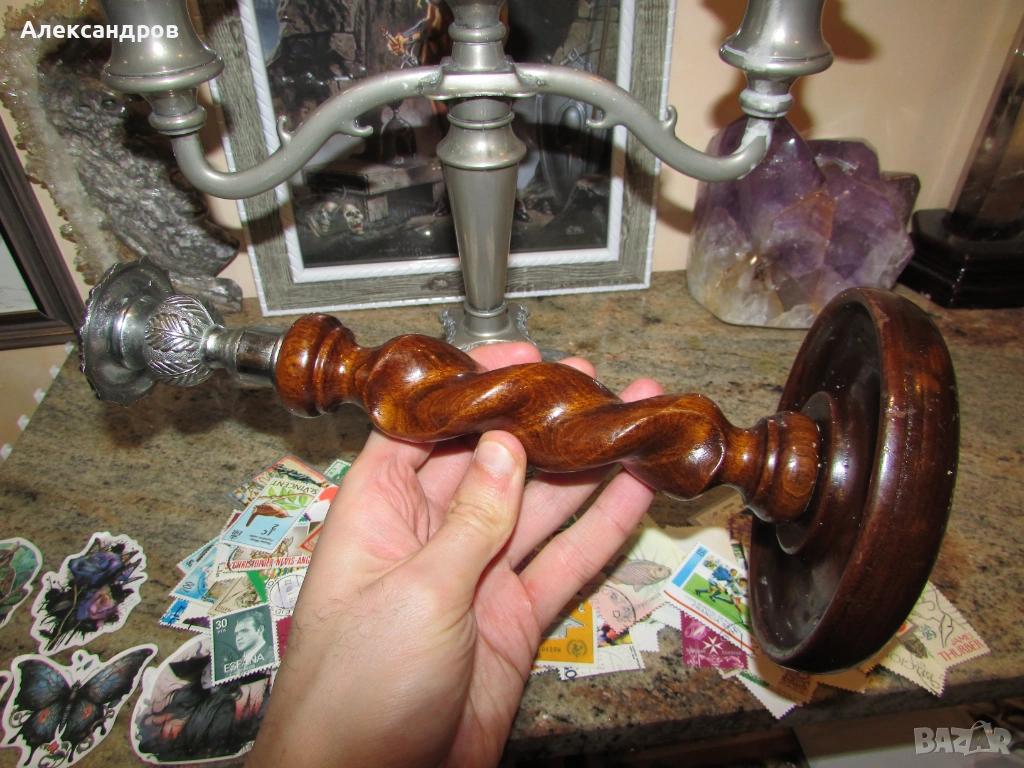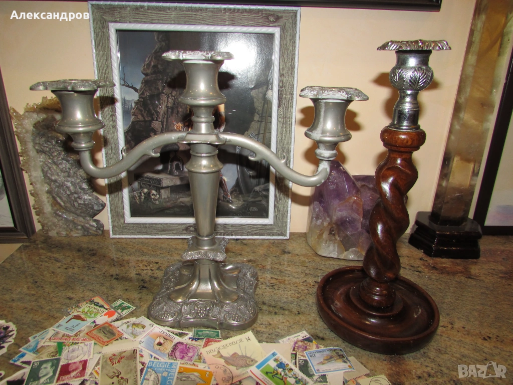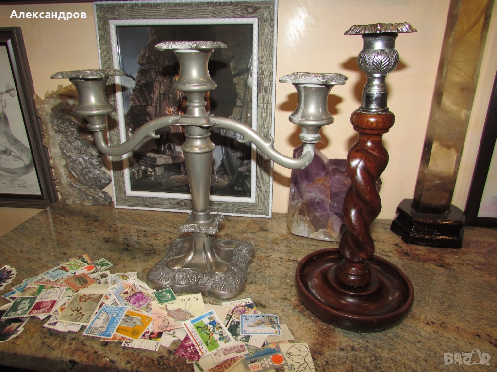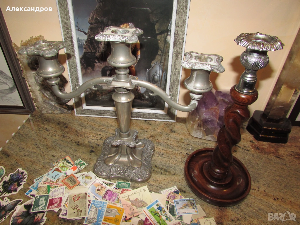 Здравейте, приятели засмяни. Продавам тези 2 свещника - един със сребърно покритие Английски мисля че на Шефилд, другия дървен, значителноо по-лек и към тях шепа марки за 25 евро. За София може лично предаване ул. Алабин. тел. 0899200343