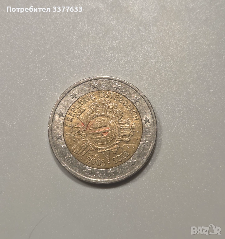 Тази монета е възпоменателна емисия от 2 евро от Австрия, издадена през 2012 г. по повод 10-годишнината от въвеждането на евро банкнотите и монетите.