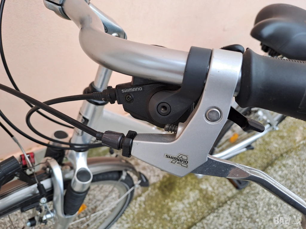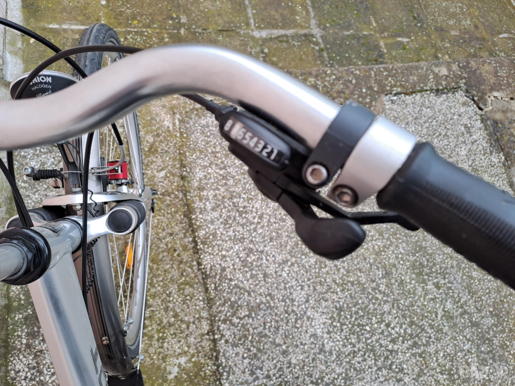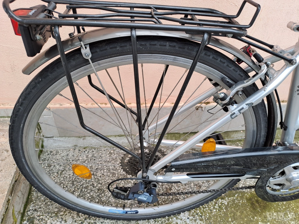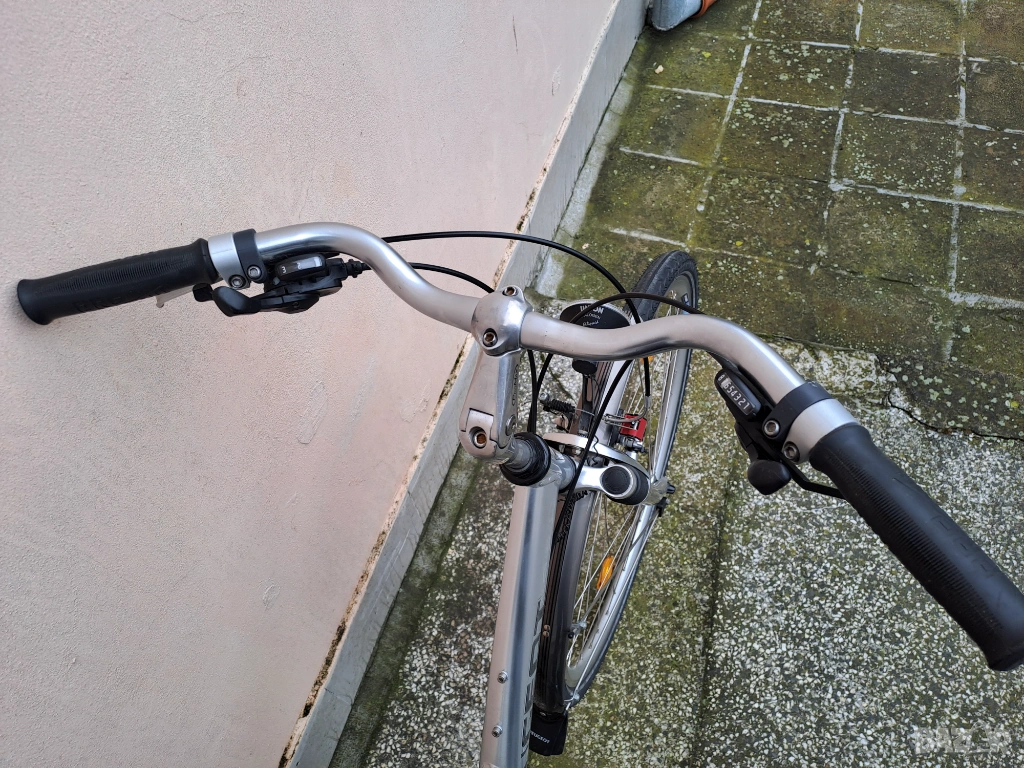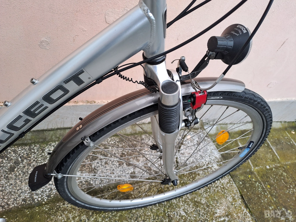 Алуминиев градски велосипед Peugeot Country с гуми 28 цола. Амортисьорна вилка и спирачки с регулиране на спирачното усилие. Скоростите са 3х8 с палцови команди. Обслужен, готов за каране.